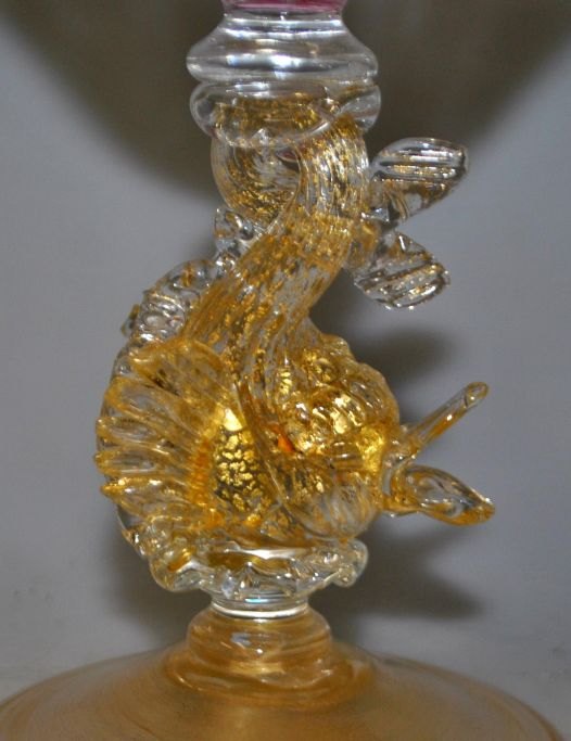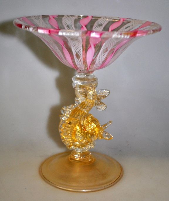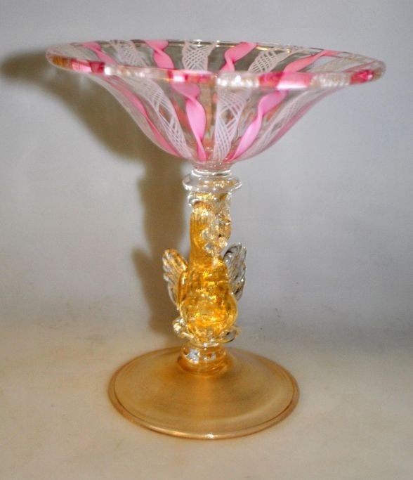 Venetian glass tazza, on a dolphin foot, 20th century Italy. Height.: 15.6 cm. Dia. bowl: 14 cm. Basin in clear glass with pink and white inlays. Base and stem in clear glass with gilding.