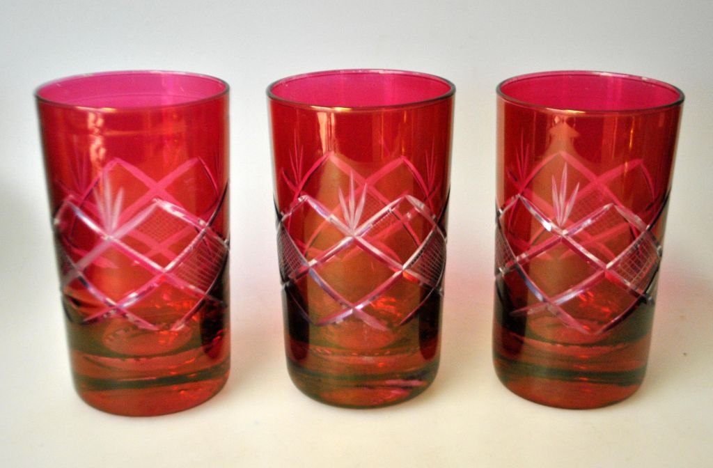 Bømiske krystal glas med slibninger, 20. årh. Med rødt overfang. H.: 10,8 cm.