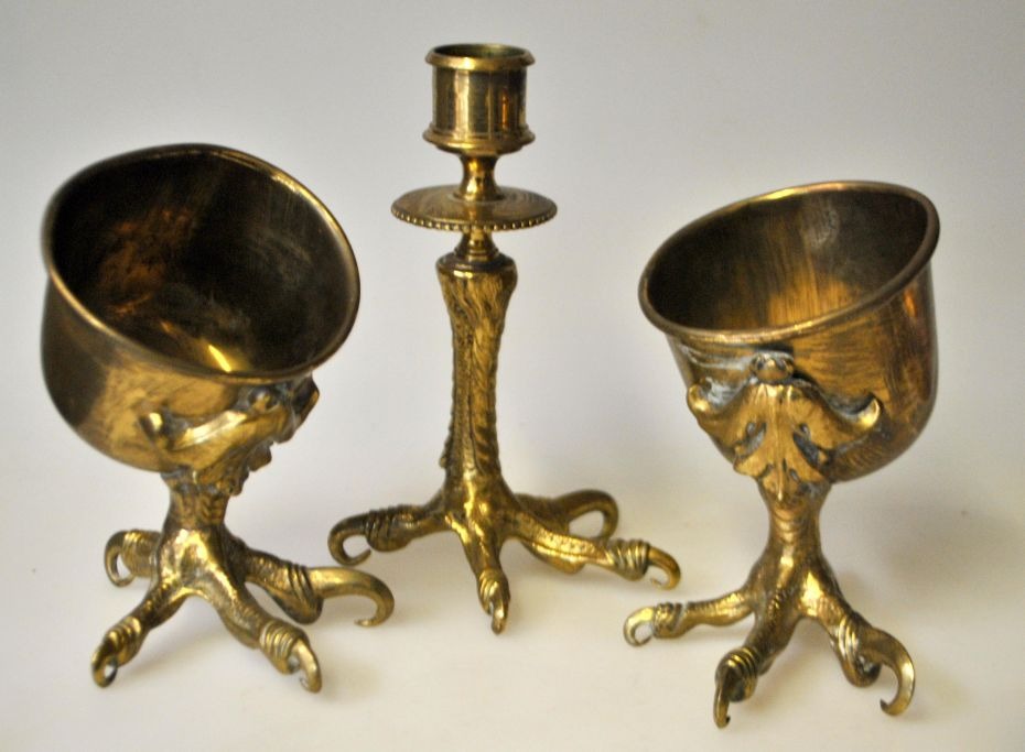 Udformet i messing og bronze. Fødder udformet som rov fuglekløer. Stage højde.: 14 cm. Bæger højde: 10,5 cm. Dia: 7 cm.