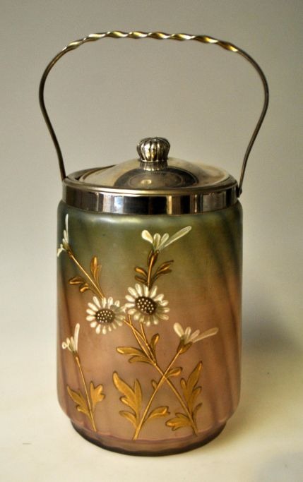 Bisquit spand, ca. 1900. Irriseret bemalet glas med emeljedekoration med blomster. Hank og låb i nikkel. H.: 19 cm. Højde med hank: 26 cm.