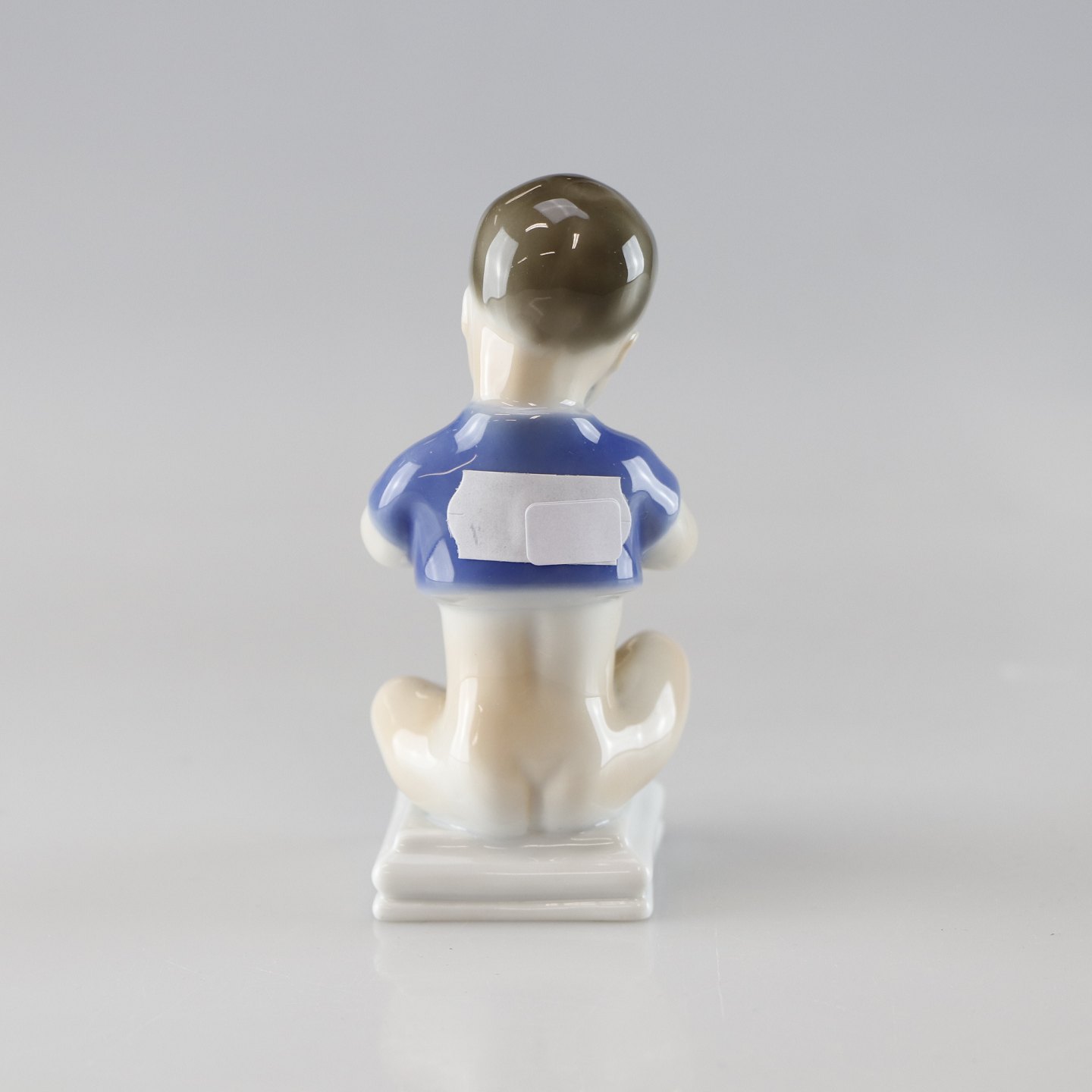Figur i porcelæn nr. L-9 med motiv af siddende dreng som knapper skjorten
