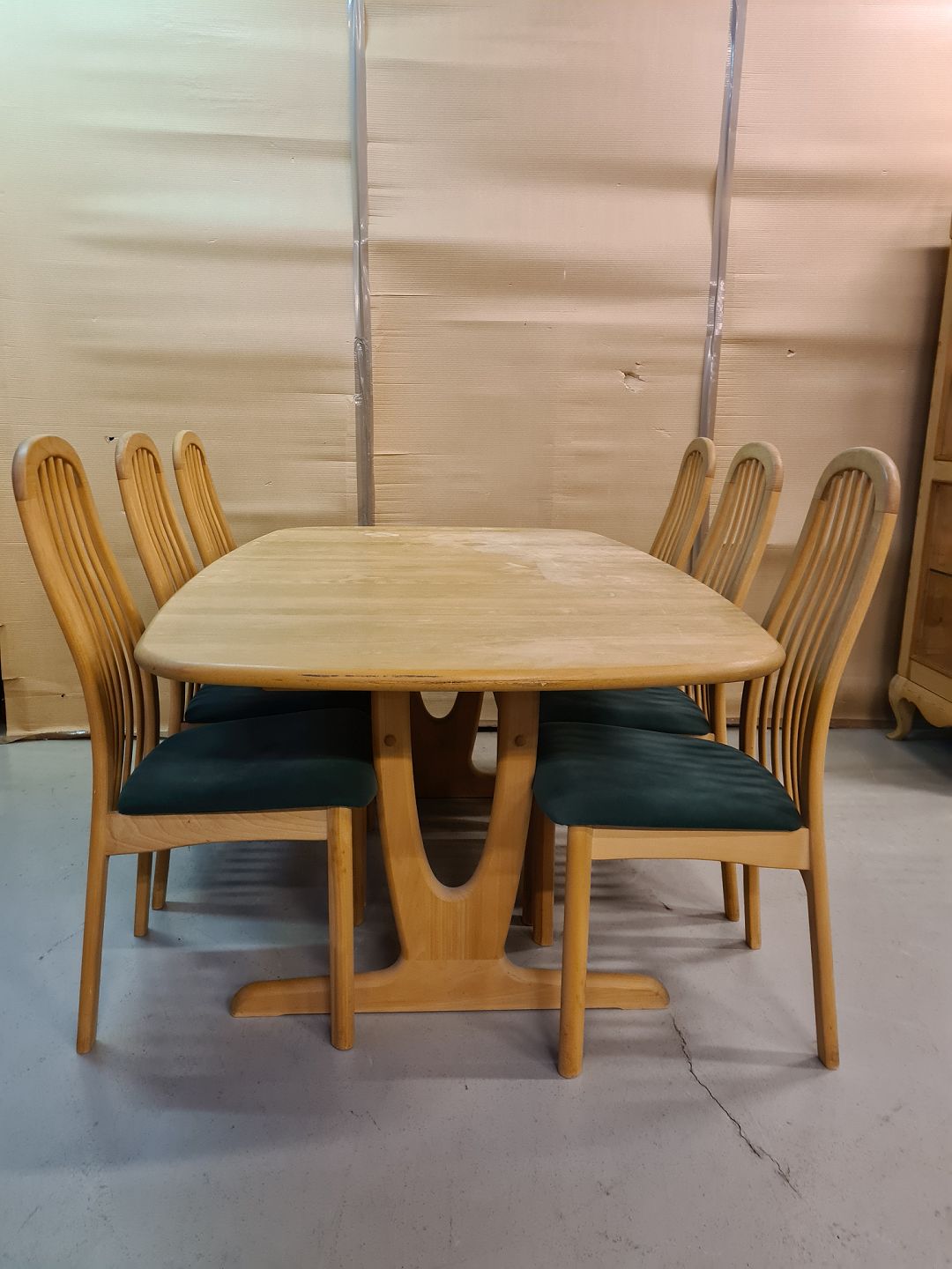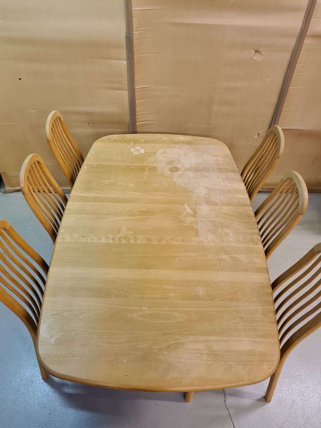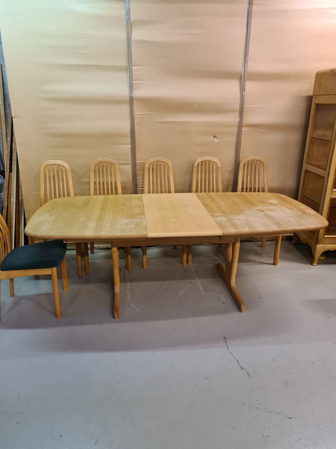 Spisebord med 1 tillægsplade og 6 stole i massivt bøgetræ, fra 2000erne.
