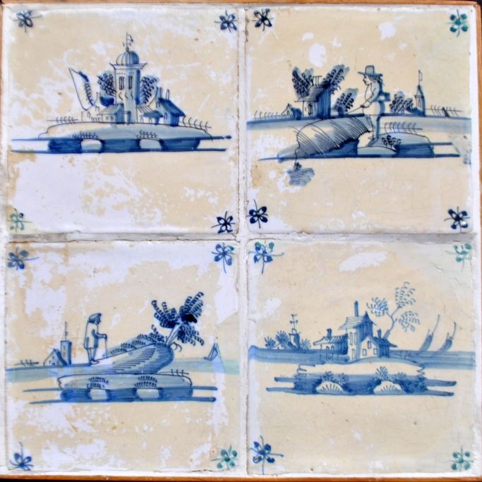 Tile fourpass, blue decorated tiles with landscapes, 18th century Netherlands.