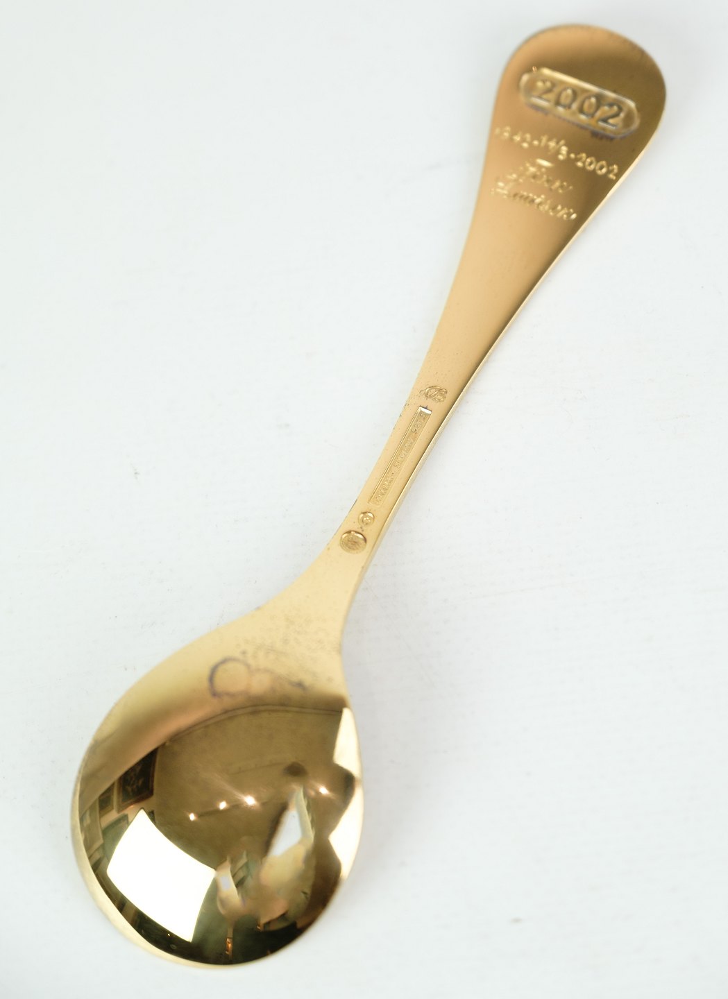 Georg Jensen har produceret en række årsskeer med forskellige blomstermotiver gennem årene. Denne ske er lavet i forgyldt sterling sølv og er i pæn stand. Designet af Annelise Bjørner, en dansk designer. Georg Jensen begyndte at producere årsskeer i 1971, denne ske er fra 2002, hvilket ville gøre den til en af de mellemste årsskeer i Georg Jensens serie. Den sidste årsske i serien blev produceret i 2004.