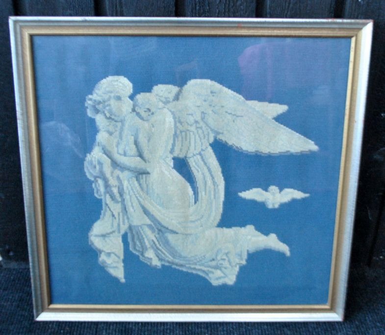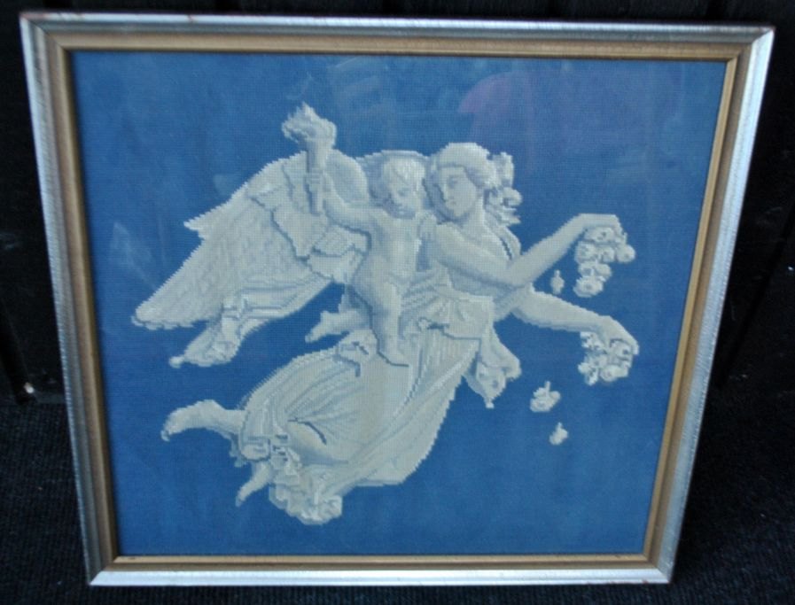 2 antique embroideries after Thorvaldsen's night and day, 19th century Denmark. 47 x 47 cm.