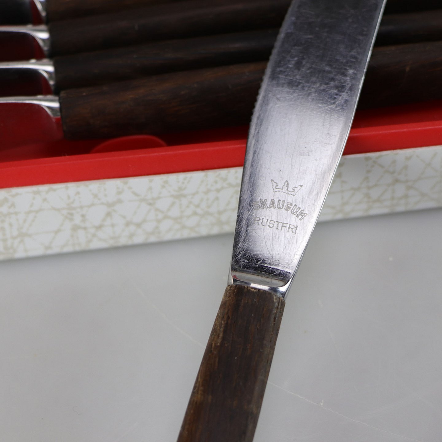 Norsk bestik til 6 pers. Består af skeer, knive og gafler i rustfrit stål og med palisander skæfte. Med tilhørende æske.