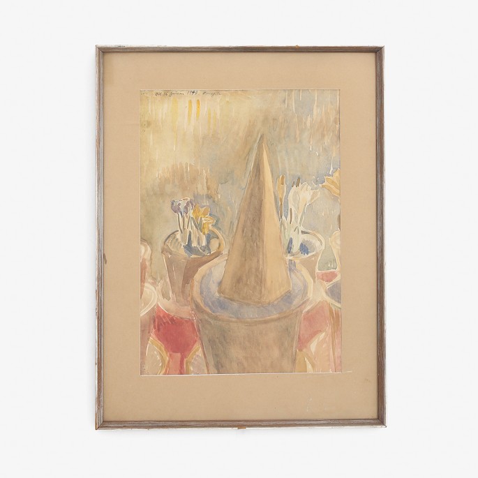 Farverig akvarel i ramme med titel 'Blomsteropstilling'. Signeret 'OK 16. Januar 1947, Daugløkke'.