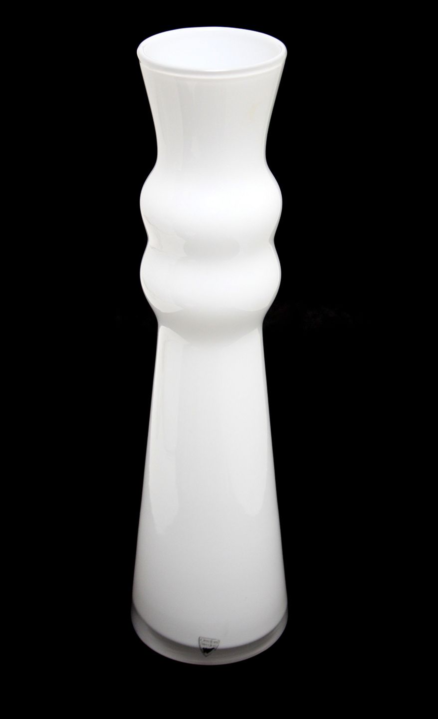 Orrefors, Sweden, Vase i opal hvid glas med klar bund. Designet af Helena Krantz. Højde 36 cm. Øverste diameter 7,5 cm. Fin stand. Pris: 375 kr.