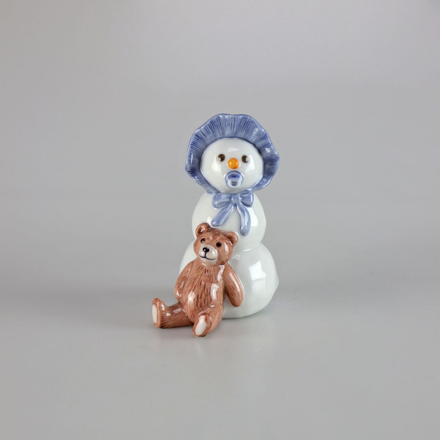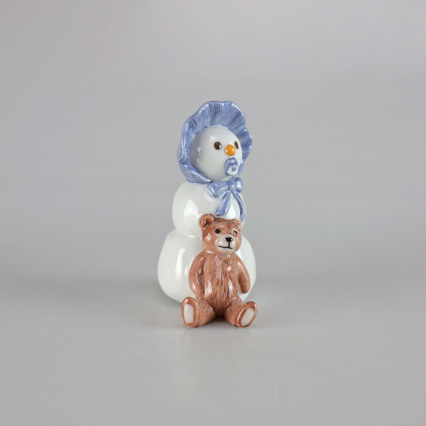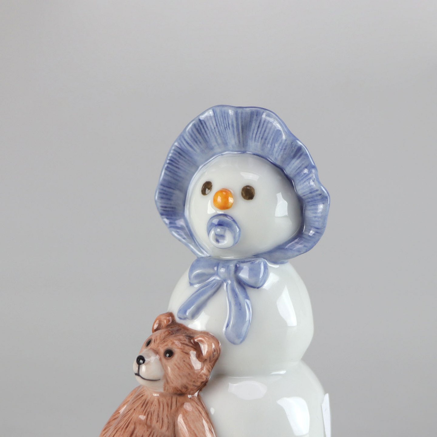 Kongelig porcelænsfigur af snemandsdreng med lyseblå kyse og brun bamse