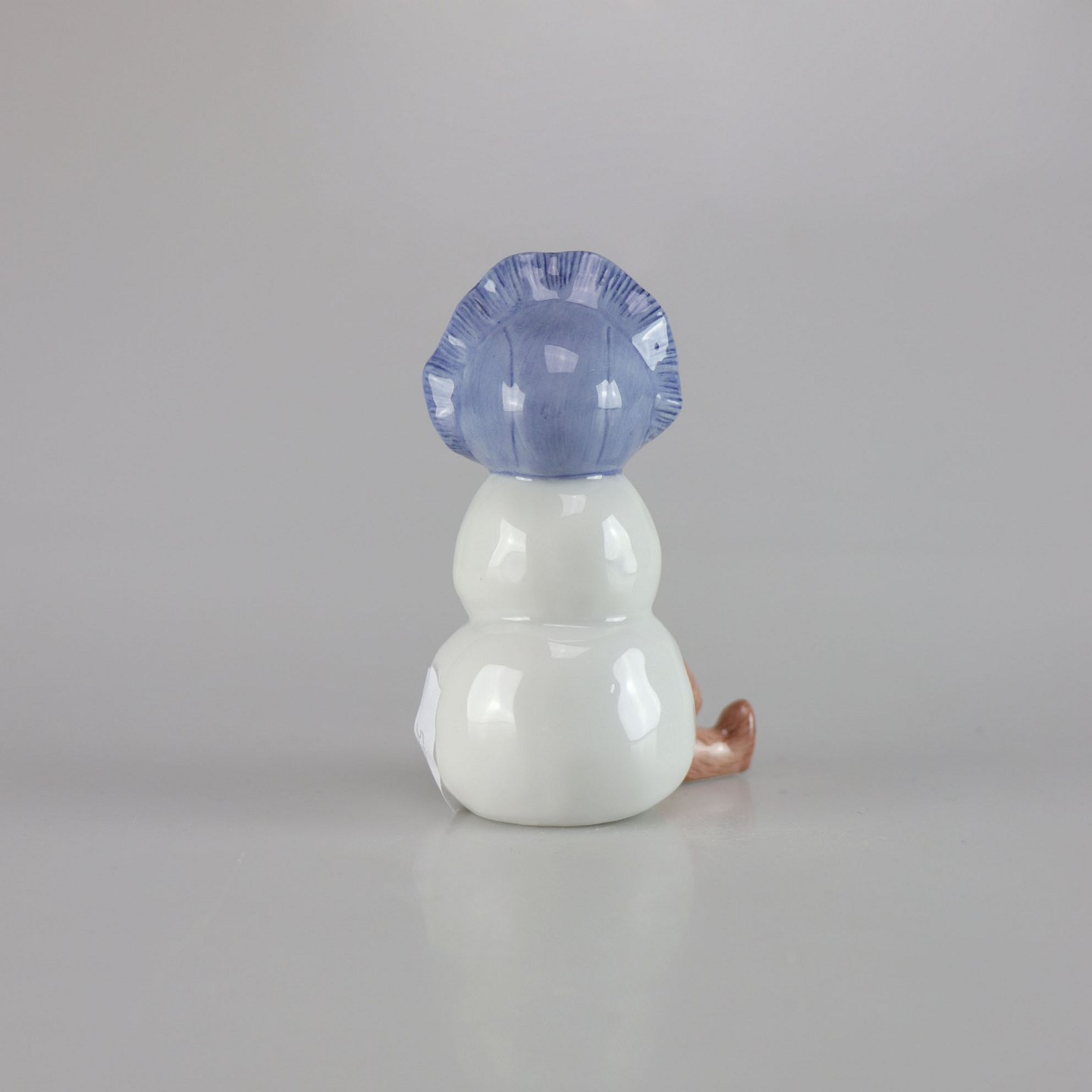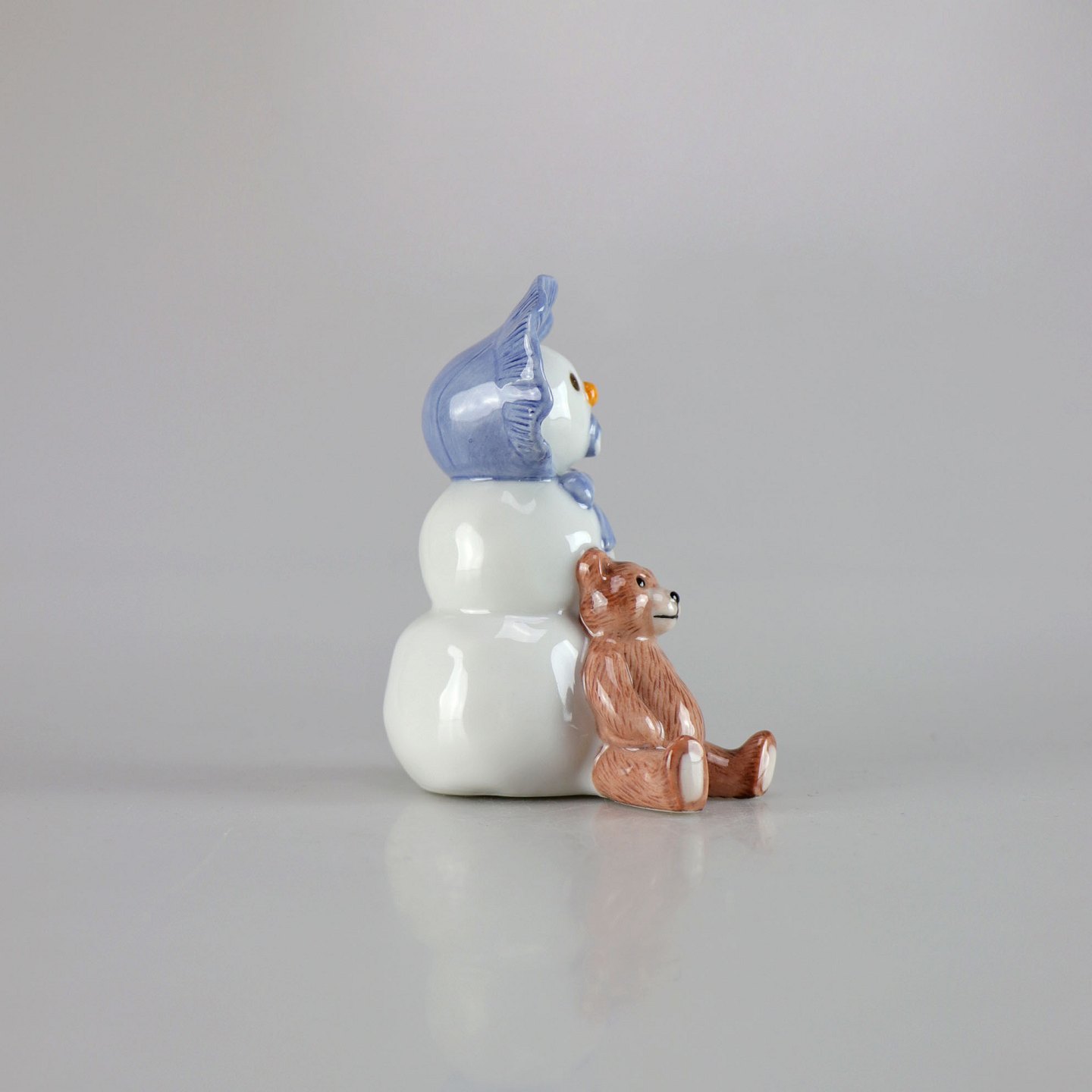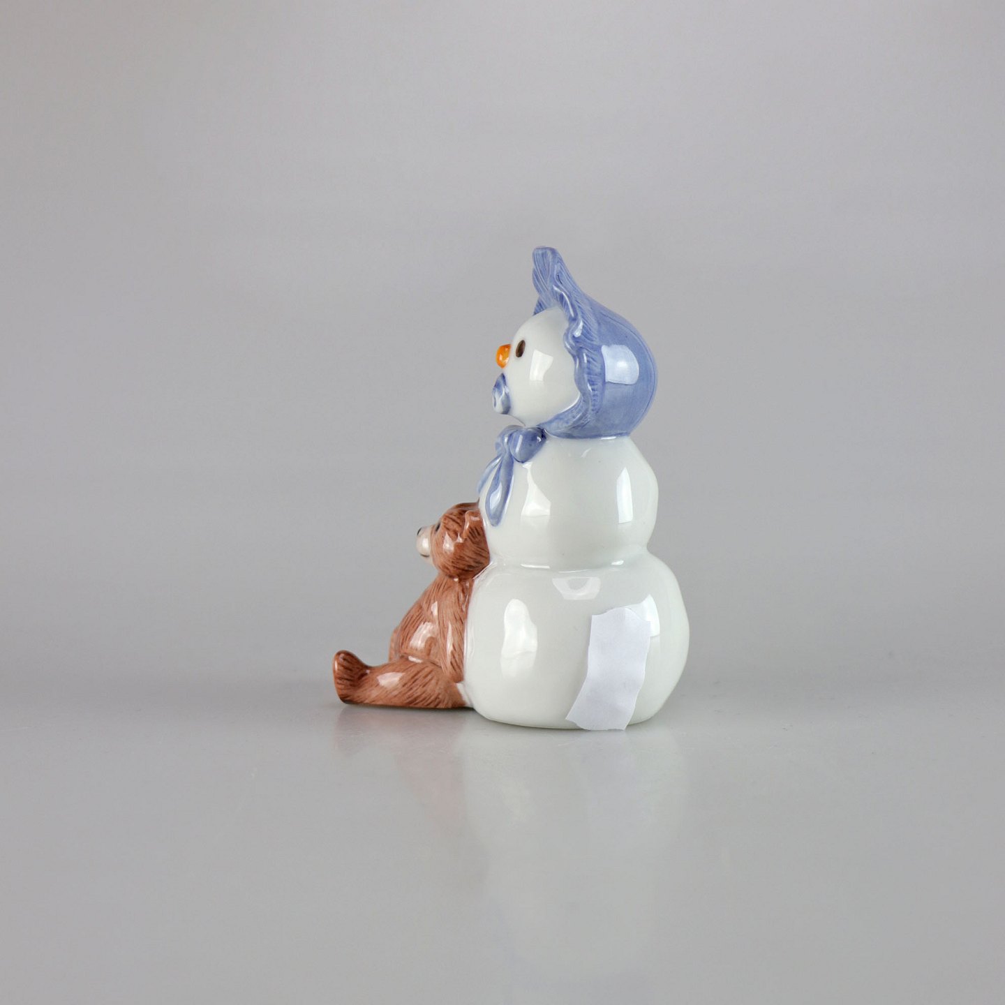 Kongelig porcelænsfigur af snemandsdreng med lyseblå kyse og brun bamse