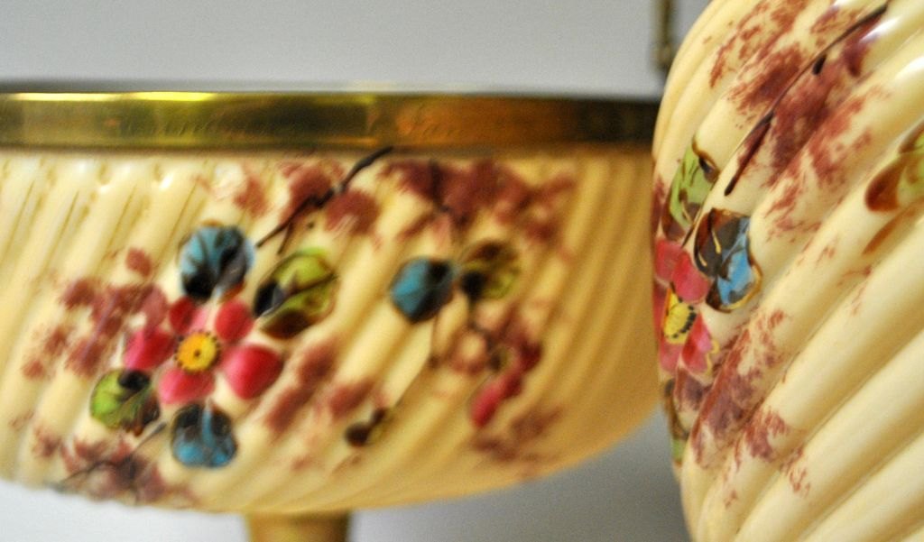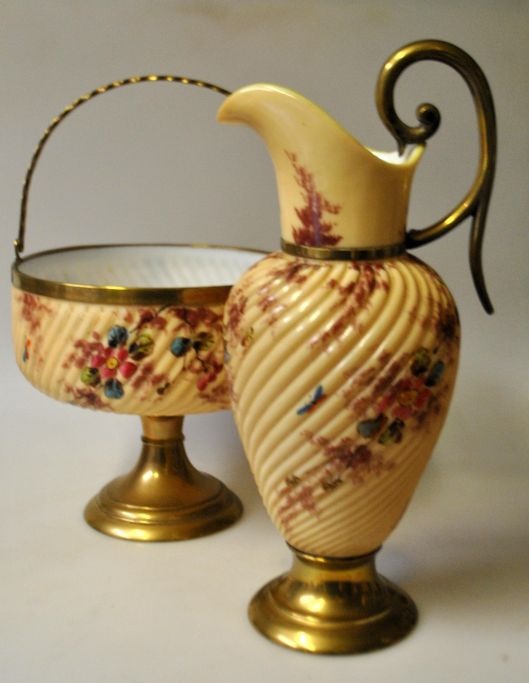 Tysk jordbærsæt, bestående af skål på fod og kande, ca. 1900. Fod og hanke i messing - tidligere forsølvet. Skål og kande i hvidt opalineglas med cream overbemaling og emalje bemalinger af blomster og insekter. Højde skål: 17,5 cm. Dia.: 18,5 cm. Kande, højde.: 28 cm.