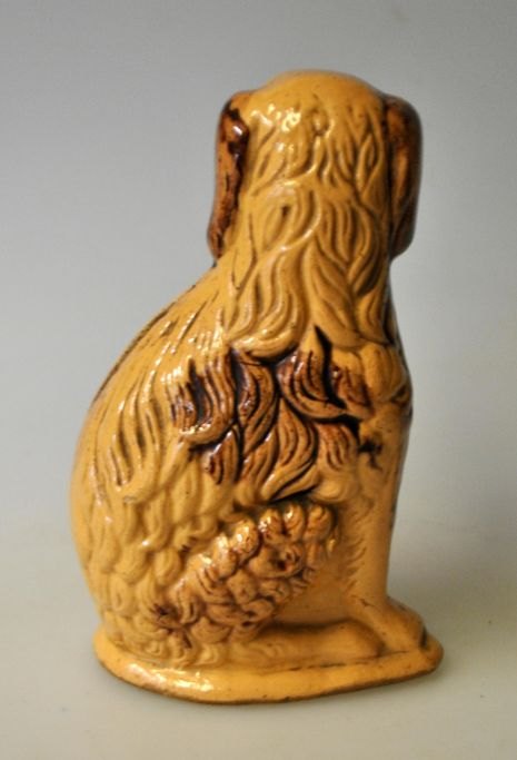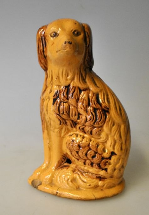Sparebøsse i form af siddende hund, Rønne, Bornholm, Cocker Spaniel. 19. årh. Gul og brunlig glaseret . H.: 13 cm.