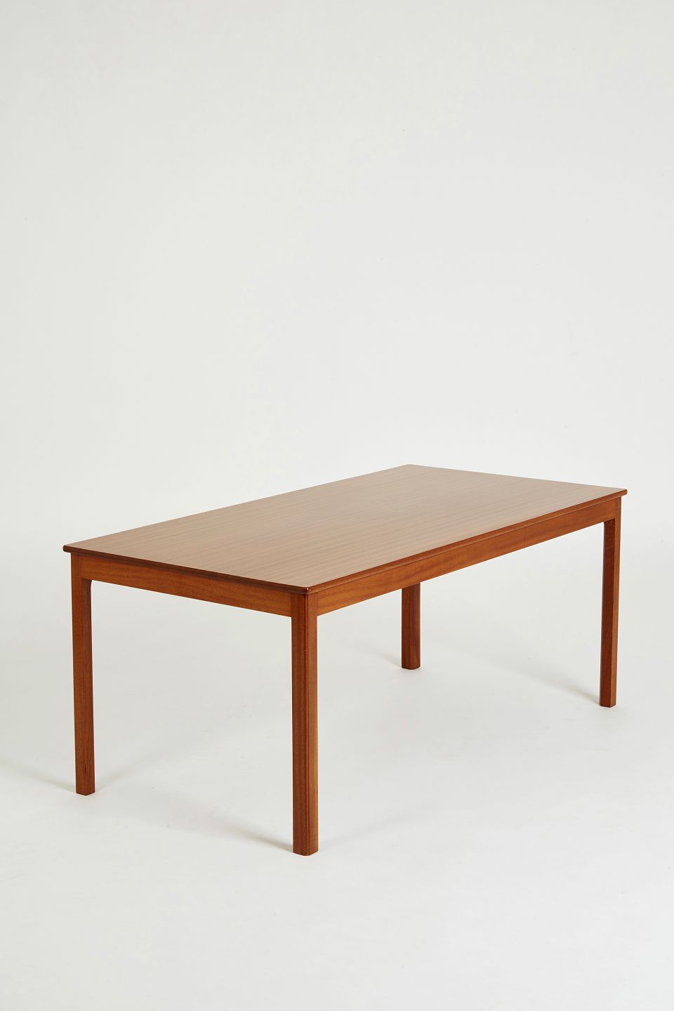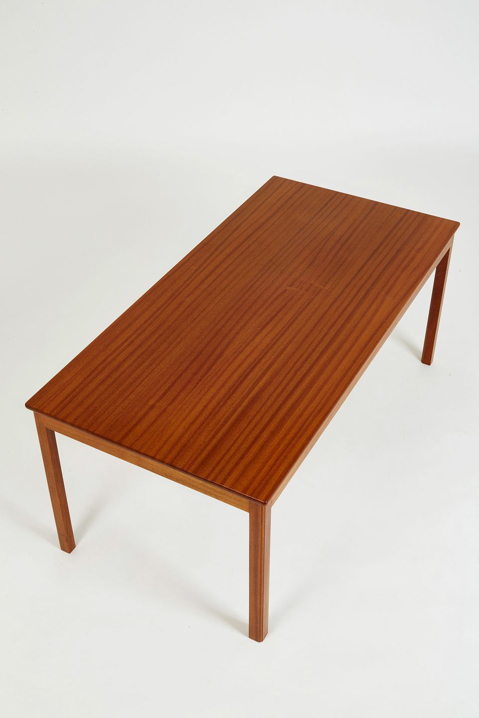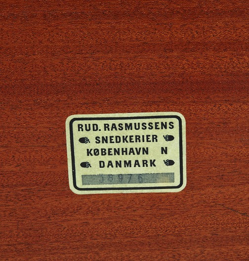 Rektangulær sofabord af mahogni. Under pladen med mærkat fra Rud Rasmussen Snedkerier