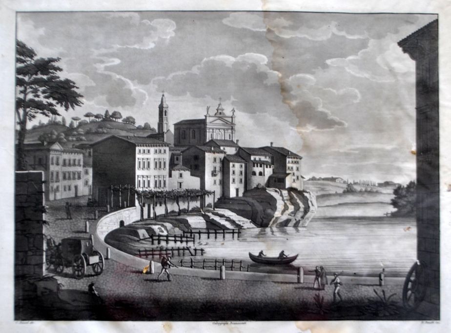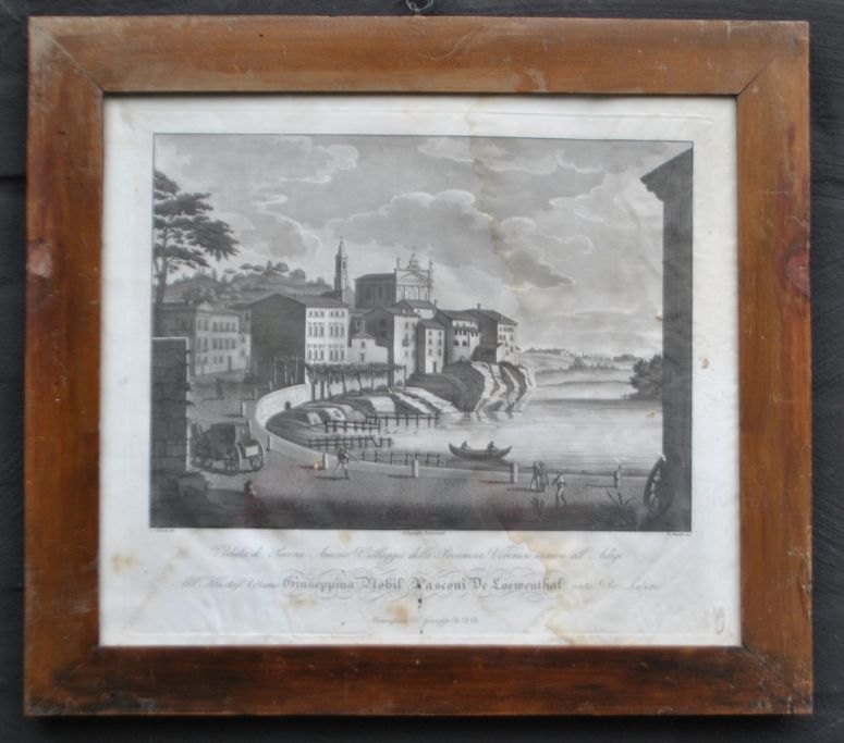 Veduta di Porona, ca. 1850. Italien. Ameno Villaggio dela Provincia Veronese in riva all Adage. Udført af C. Bissol. Aquatinte udført af D. Bonatti. 34 x 38 cm.