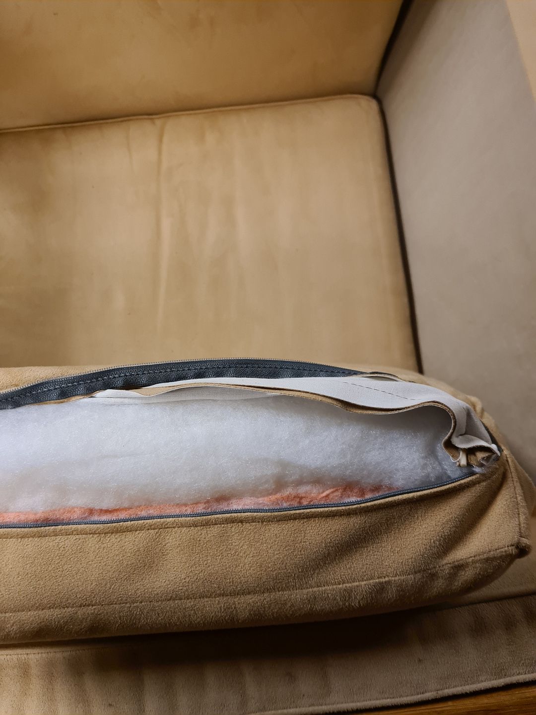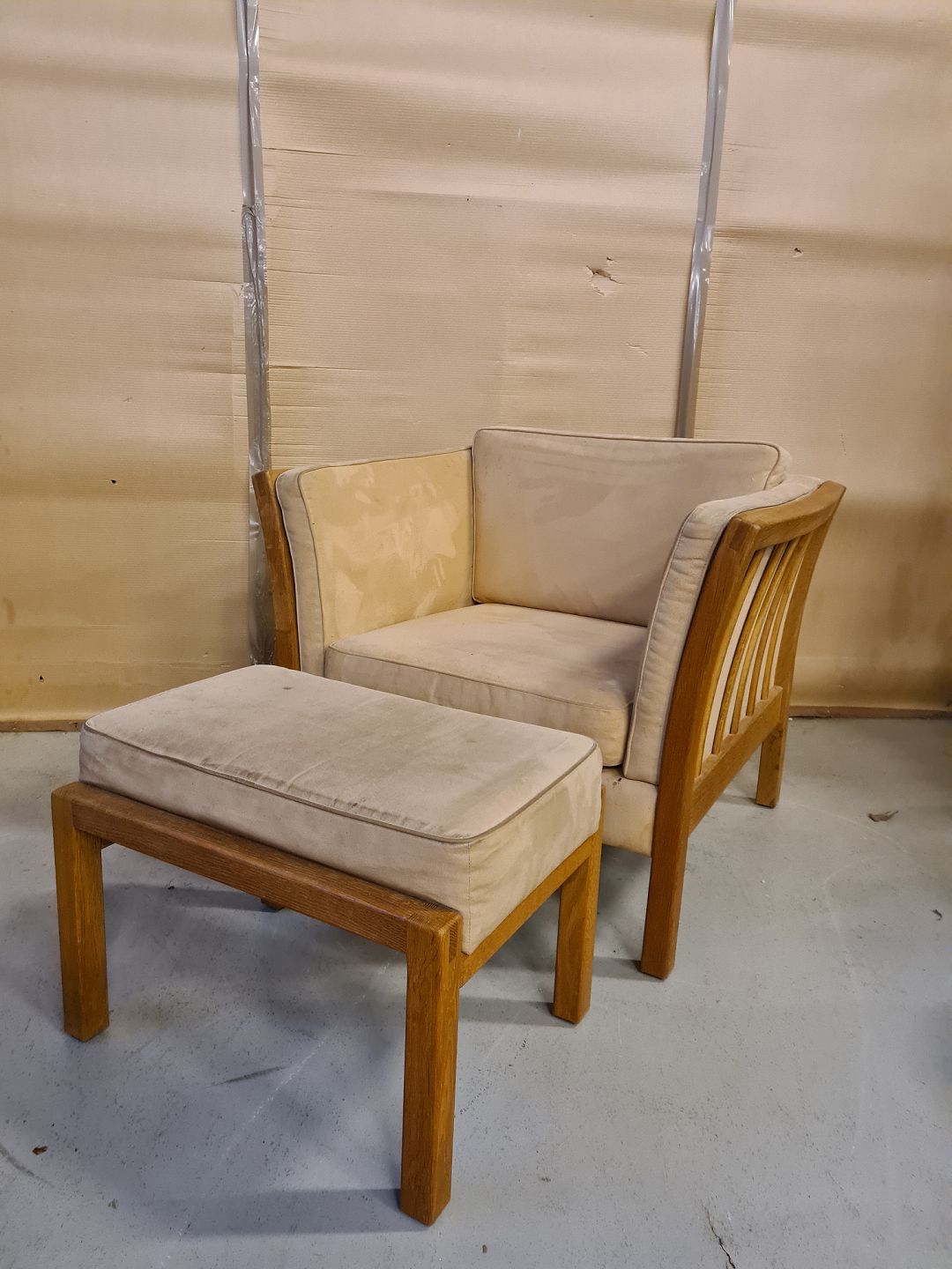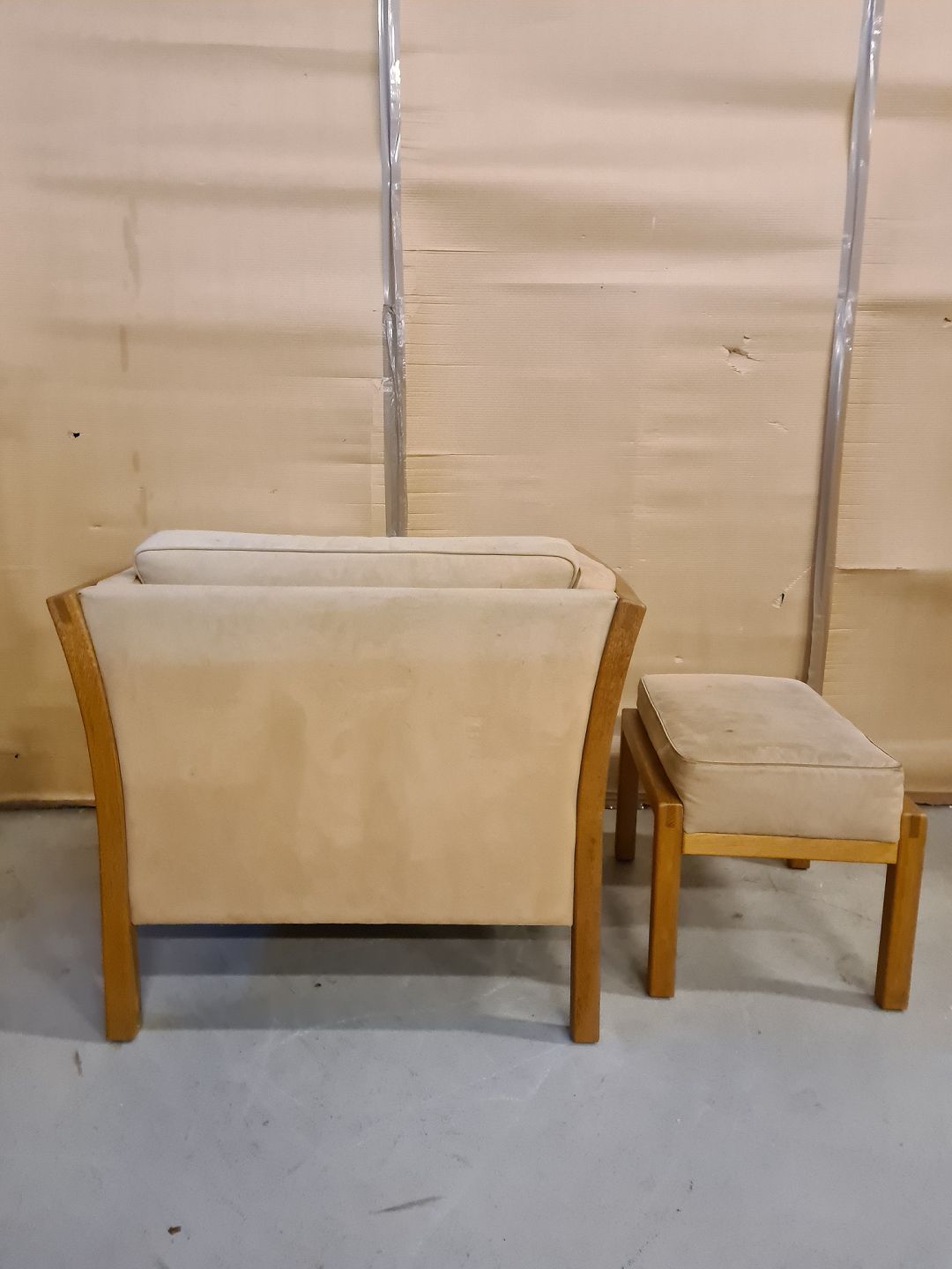 Lænestol og skammel i egetræ og kunst ruskind, fra 1990erne.