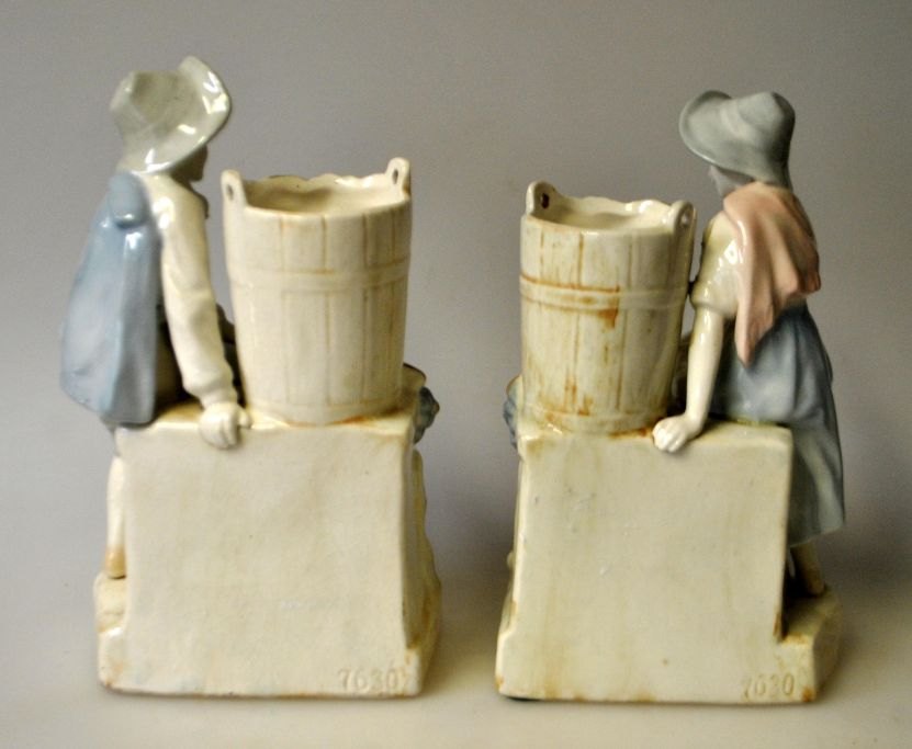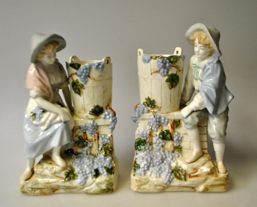 Par tyske fajance vaser, 19. årh. Dekoreret. Forstillende unge mennesker, der plukker vindruer. Stemplet med nummeret: 7630. Højde: 19 cm.