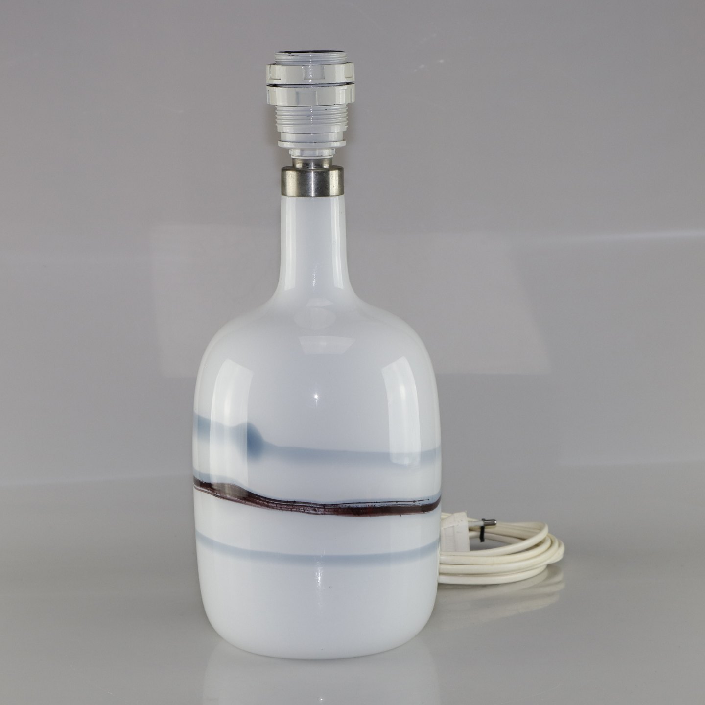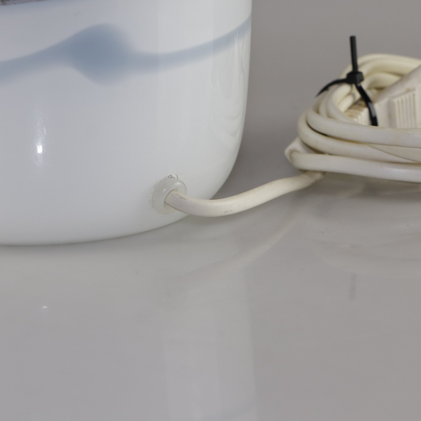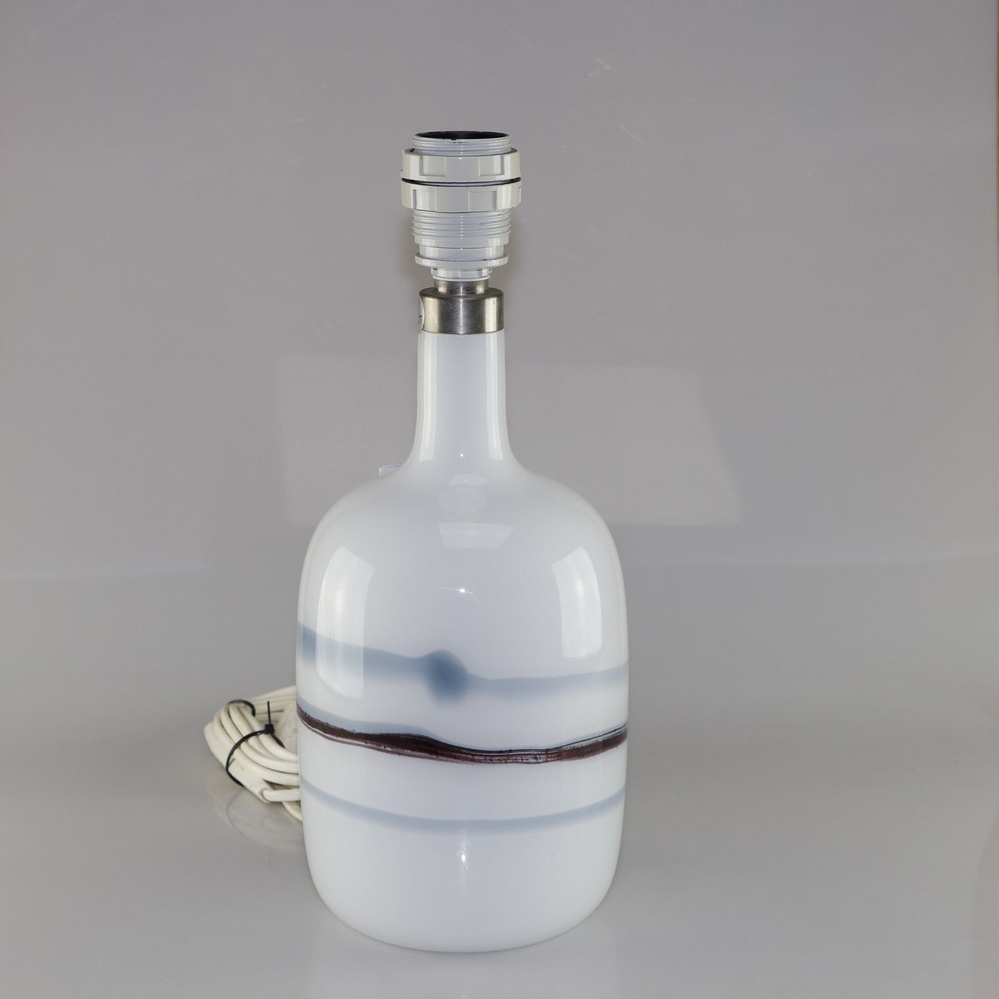 Glas bordlampe i opalhvid med vandrette linjer i mørk blå og lys blå farver