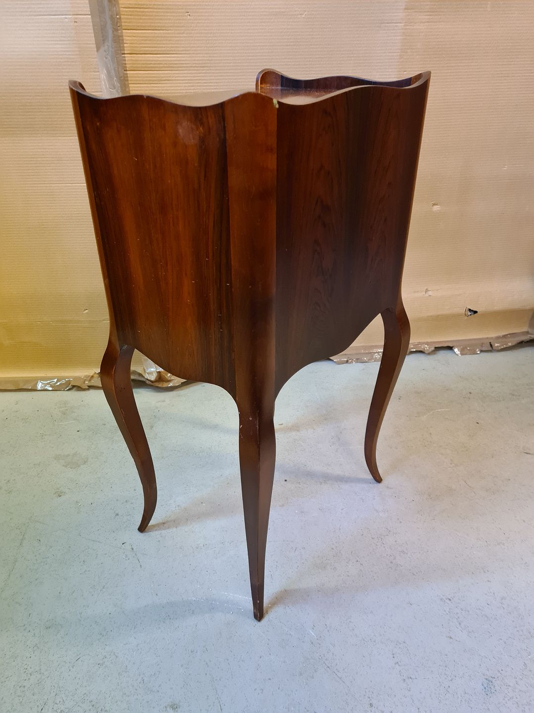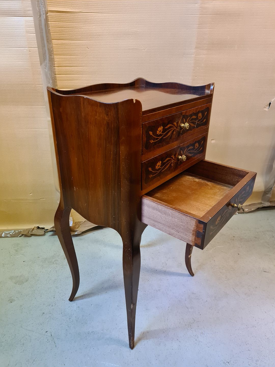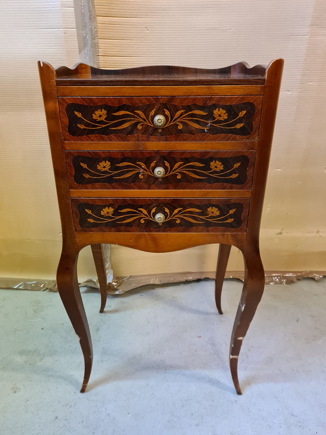 Lille kommode med intarsia i palisander og bøgetræ, fra 1980erne.