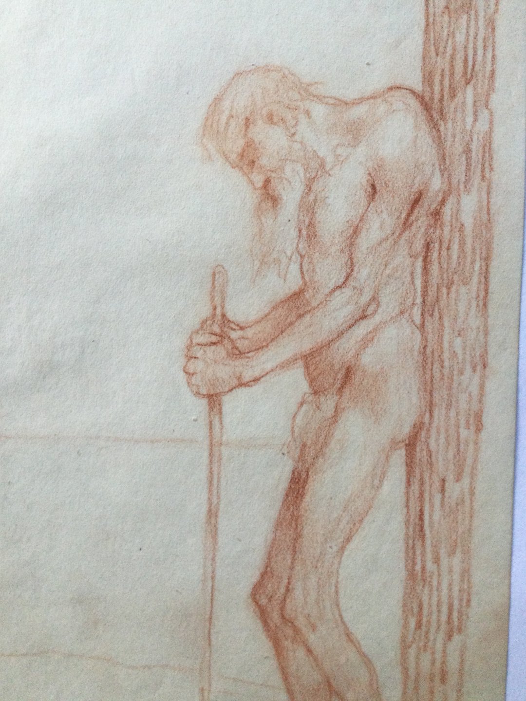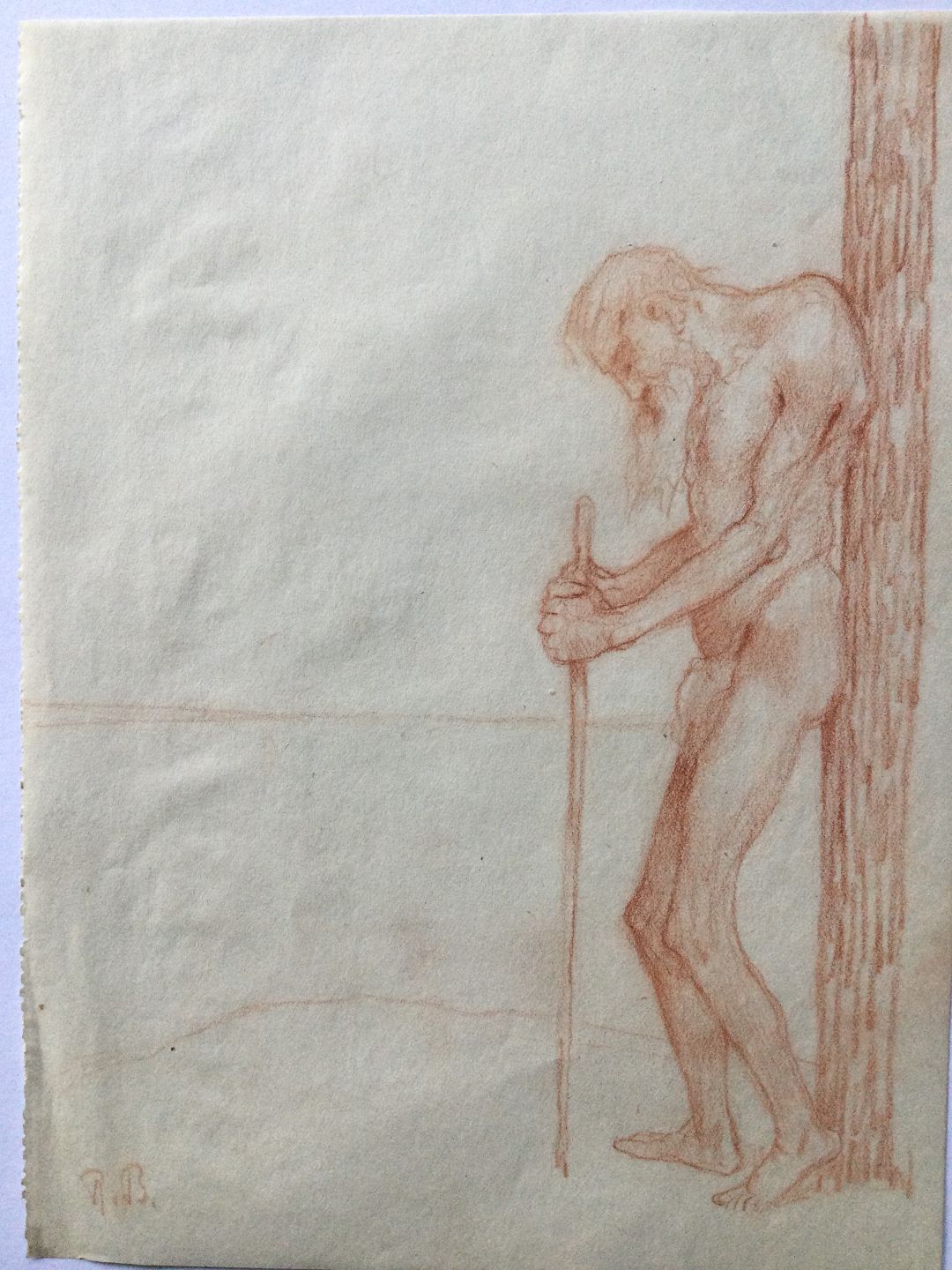 Tegning af Robert Büchtger - Gammel mand med lændeklæde og stav ved træ.