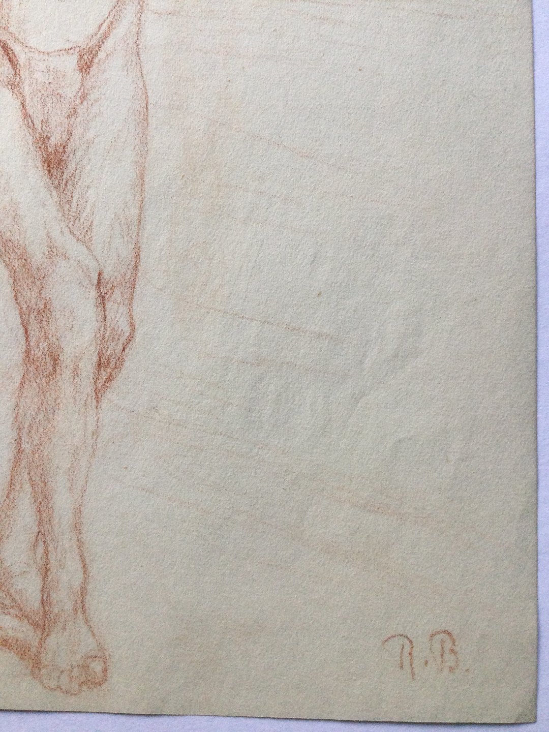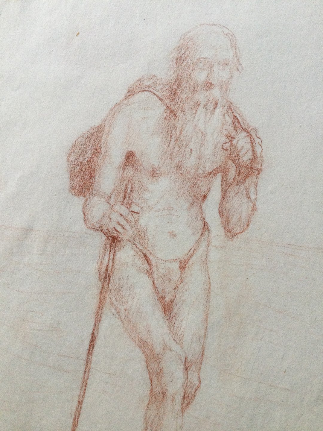 Tegning af Robert Büchtger - Gående gammel mand med lændeklæde og stav.