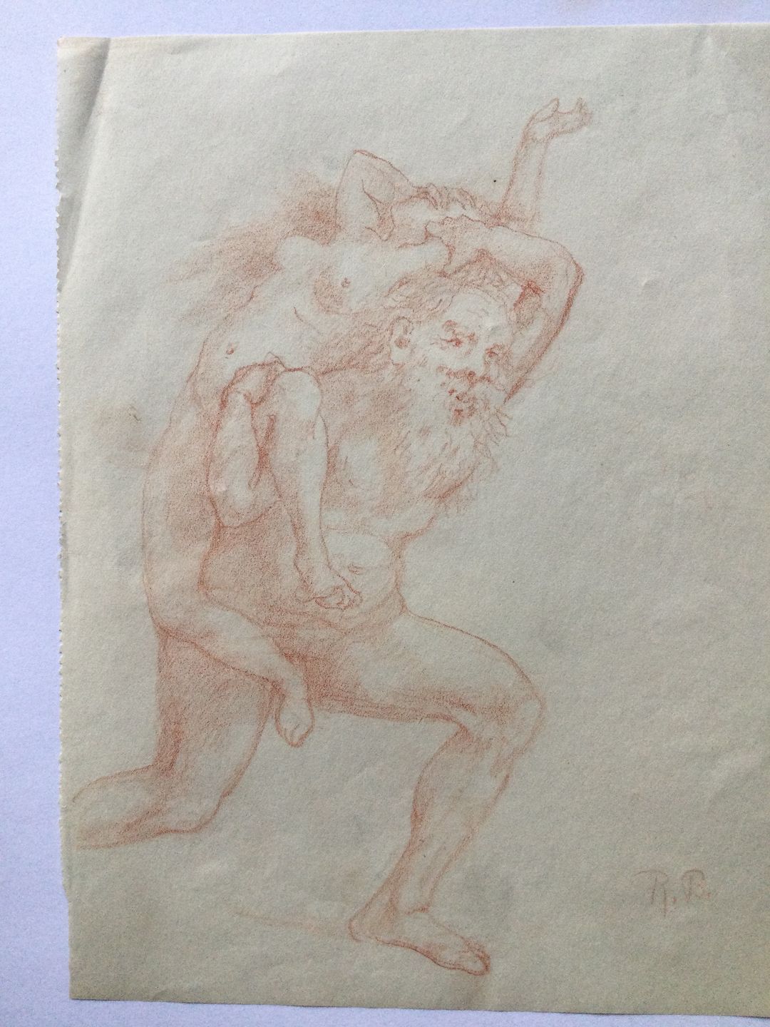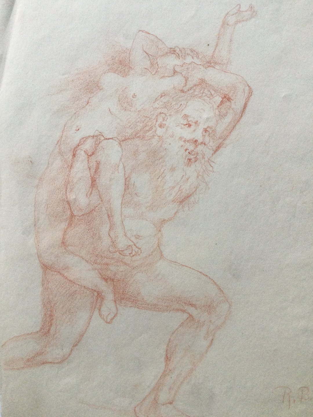 Tegning af Robert Büchtger - Nøgen kvinde på skuldreren af en nøgen gammel mand.