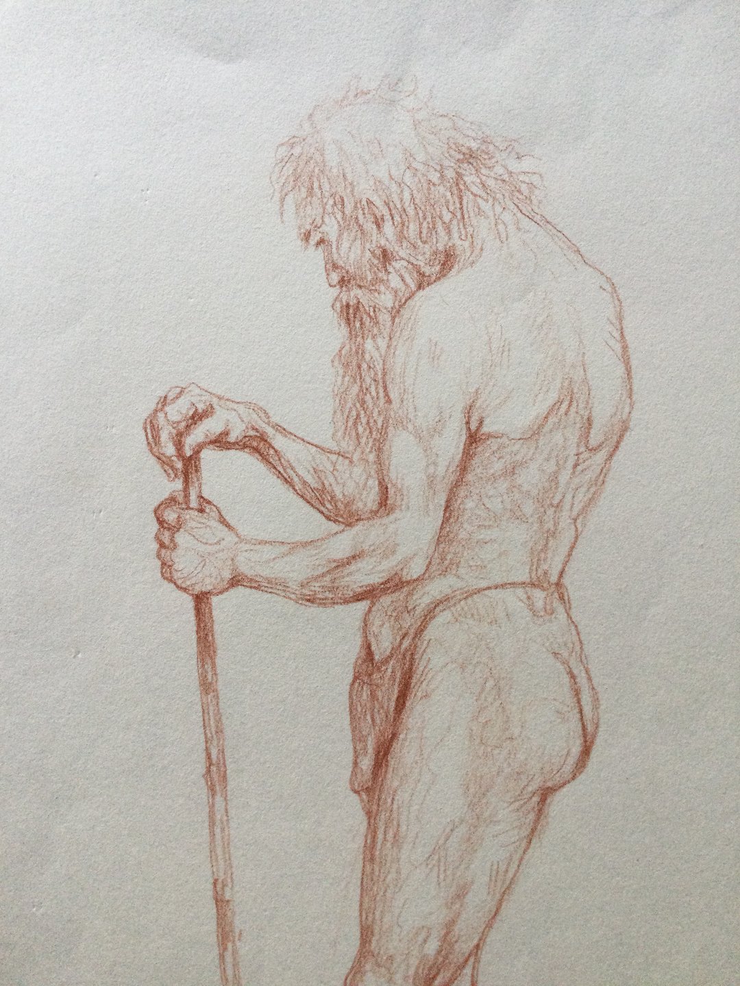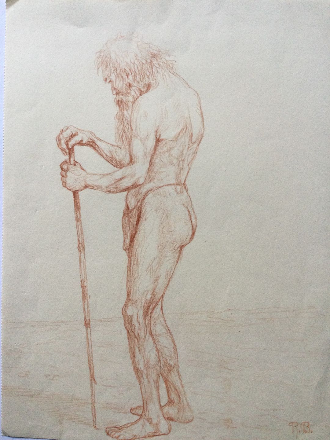 Tegning af Robert Büchtger - Gammel mand med stav og lændeklæde.