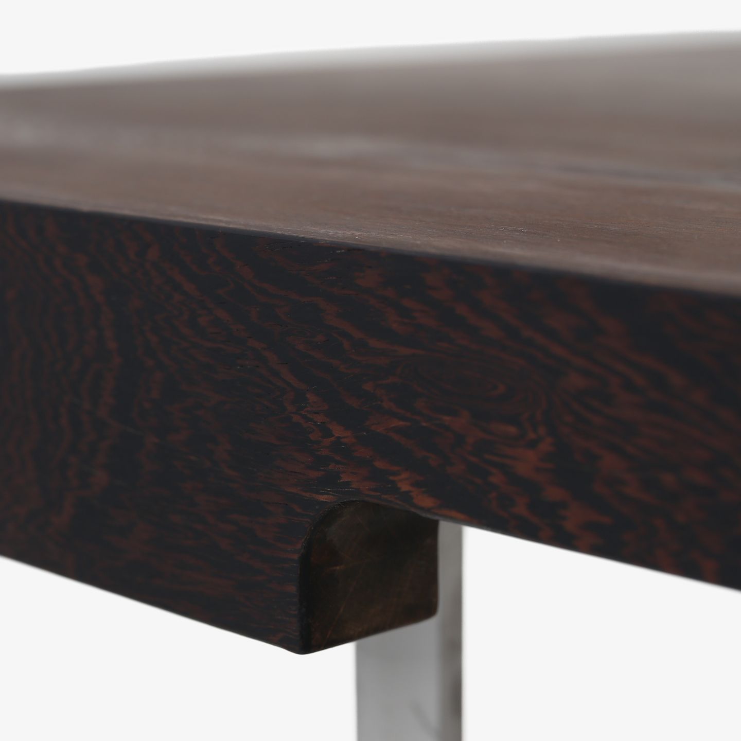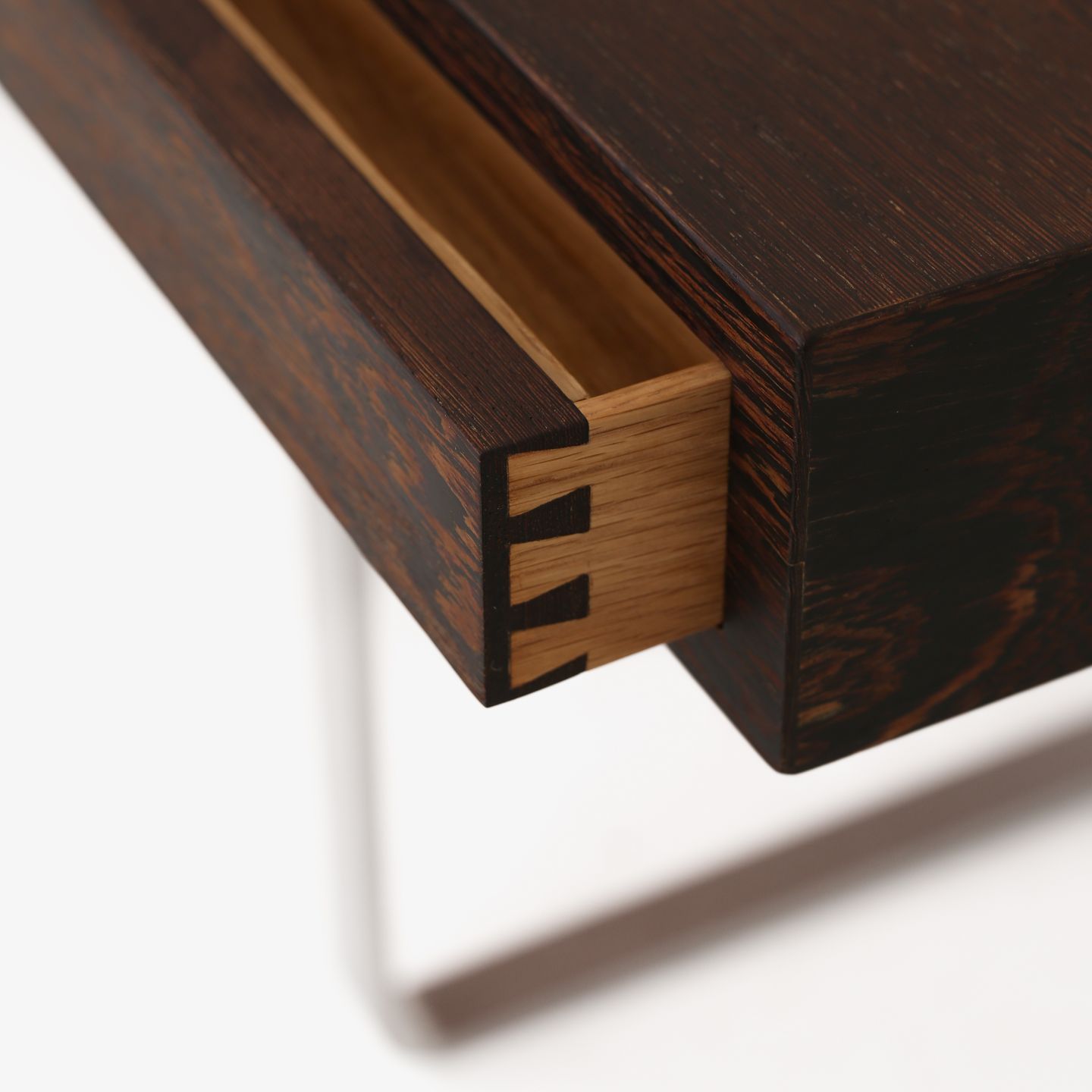 JH 810 - Fritstående skrivebord med kassetteformet top i wengé. Front med to skuffer, bøjlestel og greb af matforkromet stål. Formgivet i 1970.