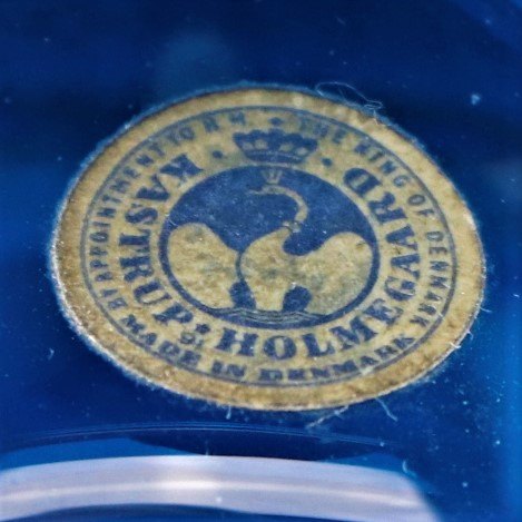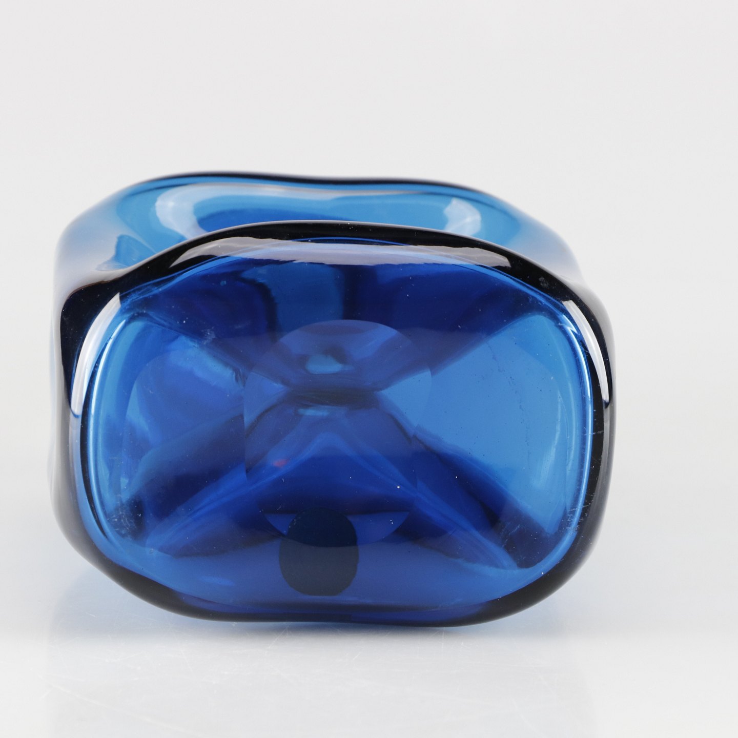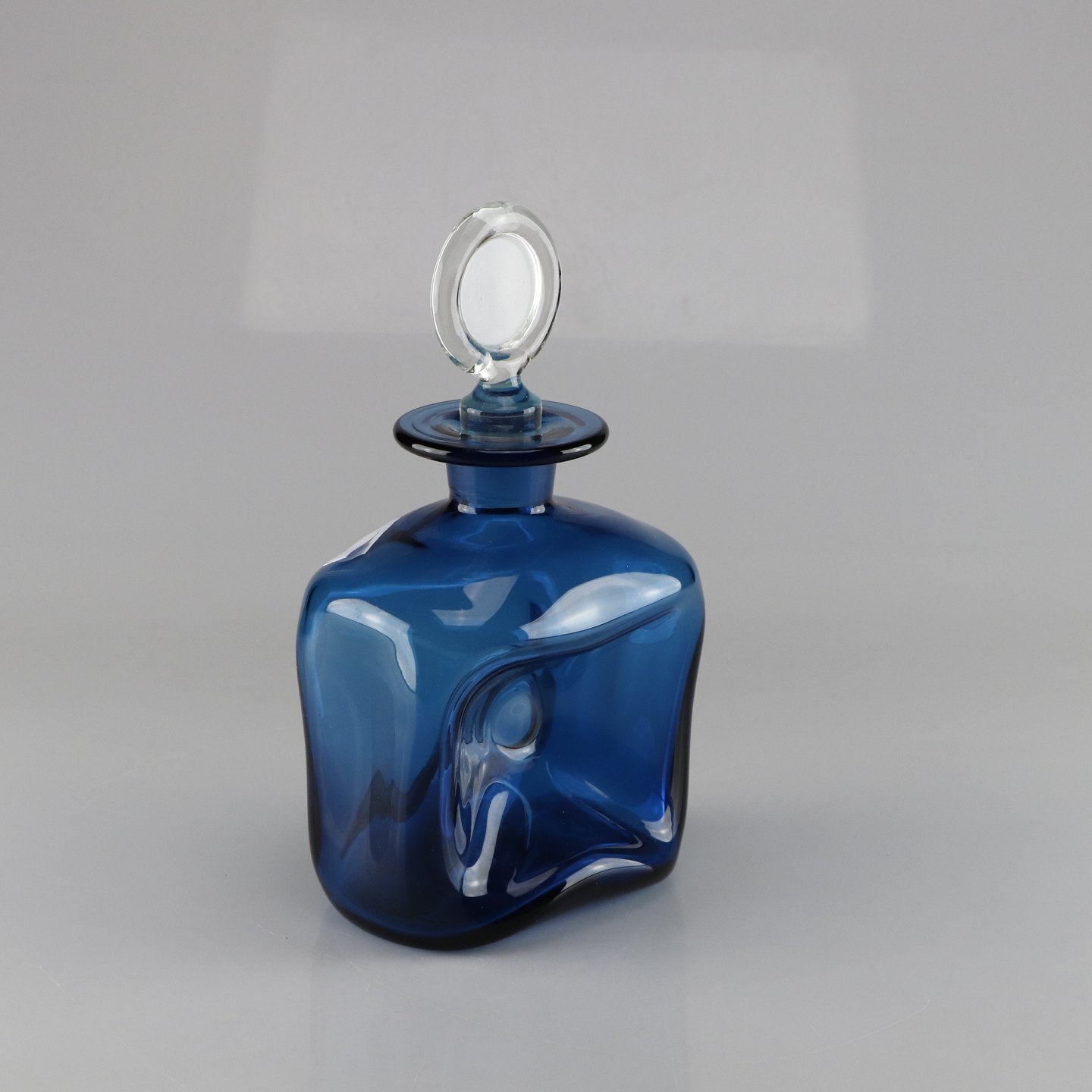 Kvadratisk karaffel sammenklemt på midten lavet af blåt glas