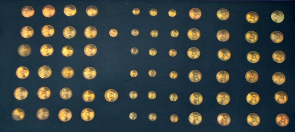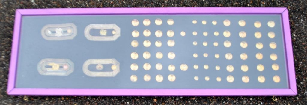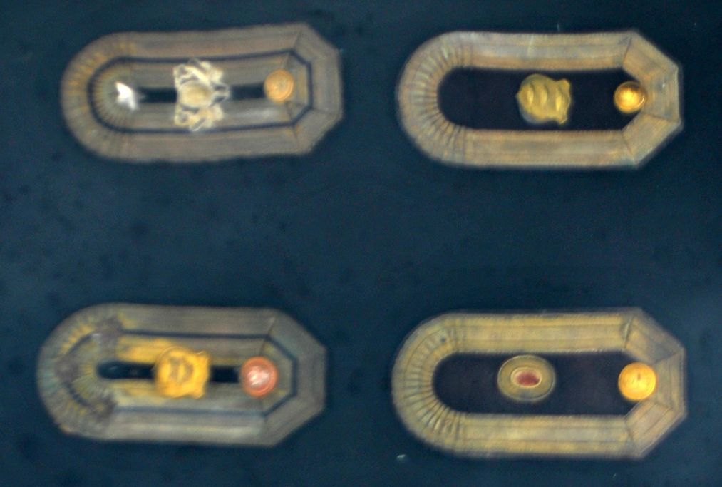 Collection of fireman's buttons/shoulder patches 19./20. C. Consisting of 4 antique epaulettes and 68 buttens, mounted on fabric. In violet painted display case, 31 x 97 cm.