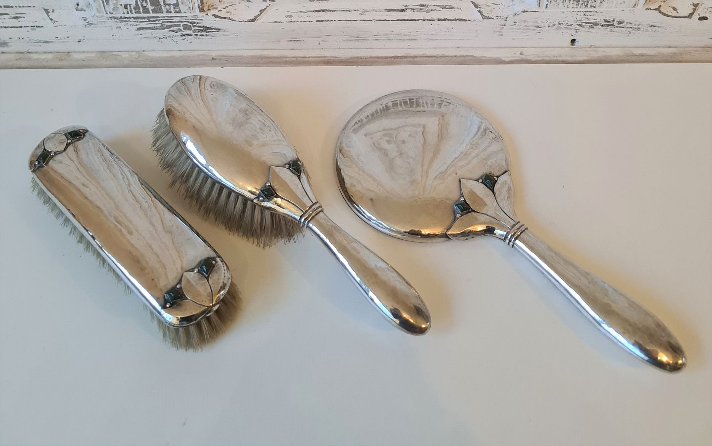 Art Nouveau toilet set by Emil Hansen - Odense. The set is produced in silver adorned with green stones - presumably chrysoprase.