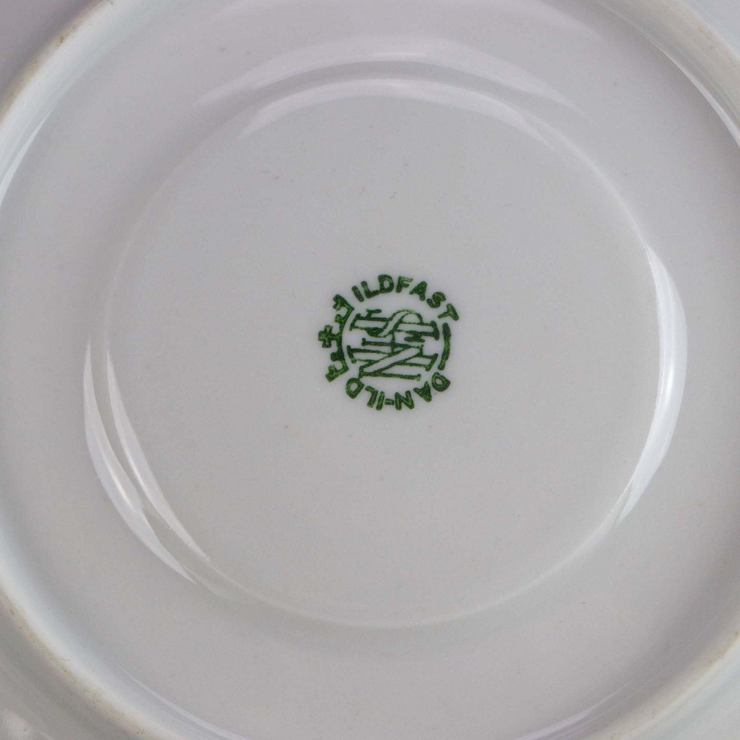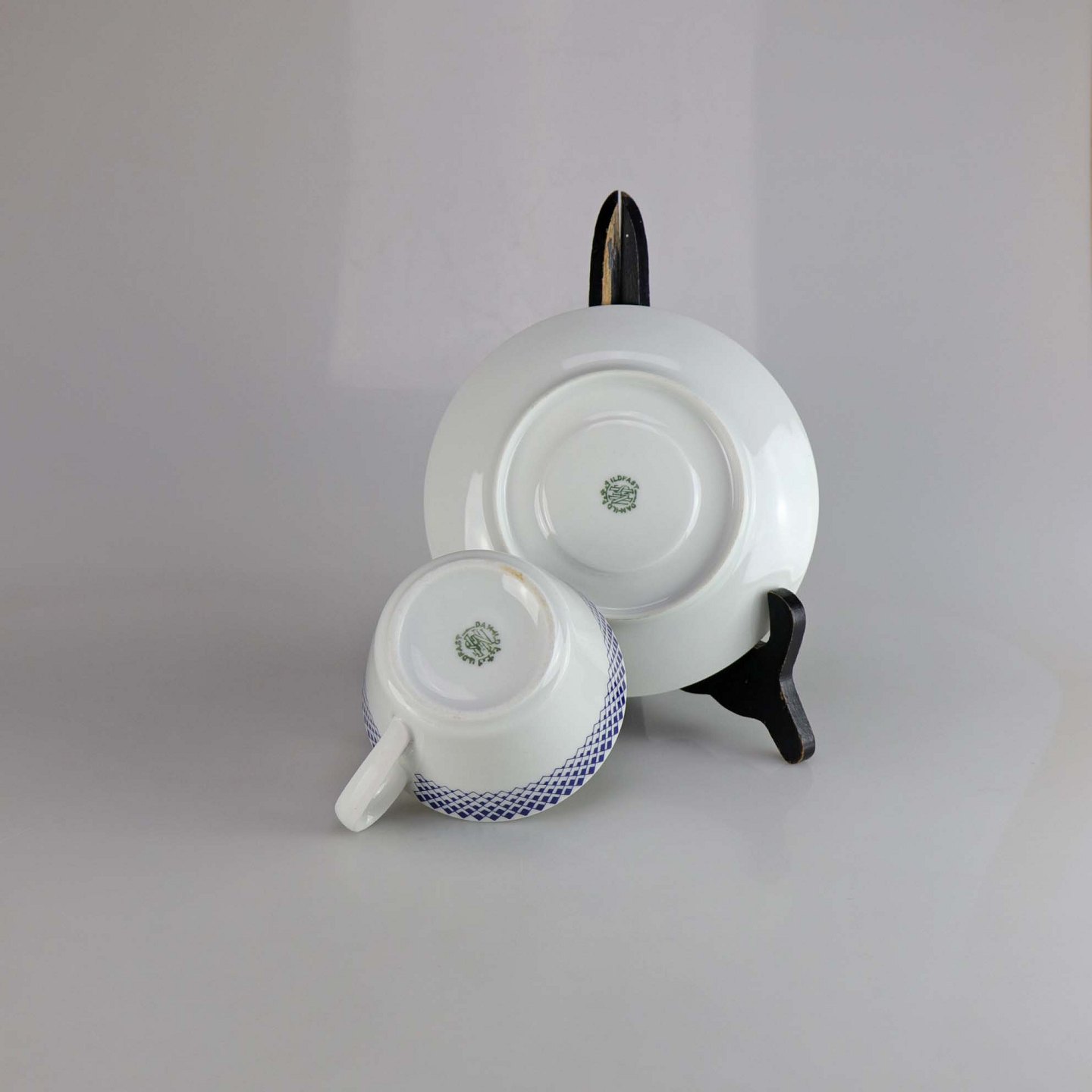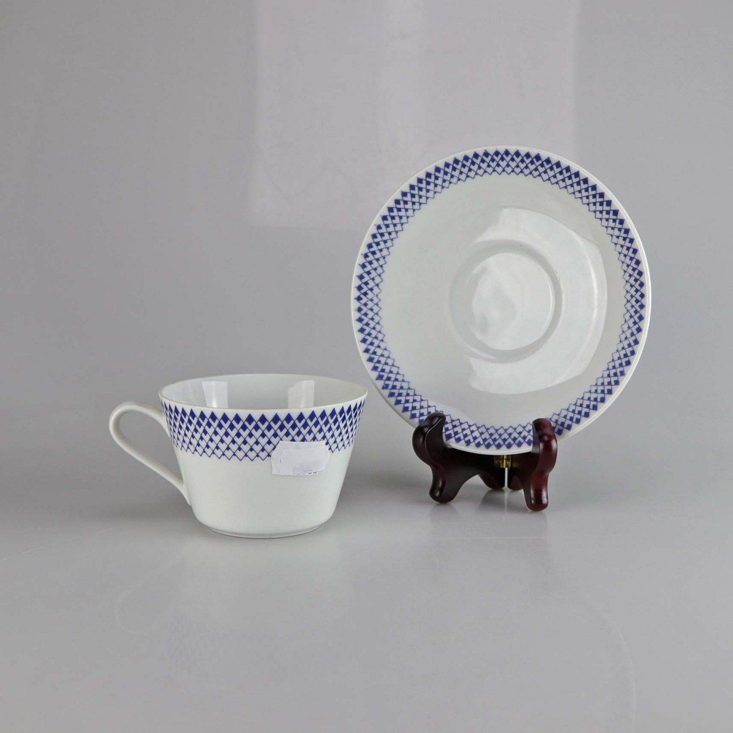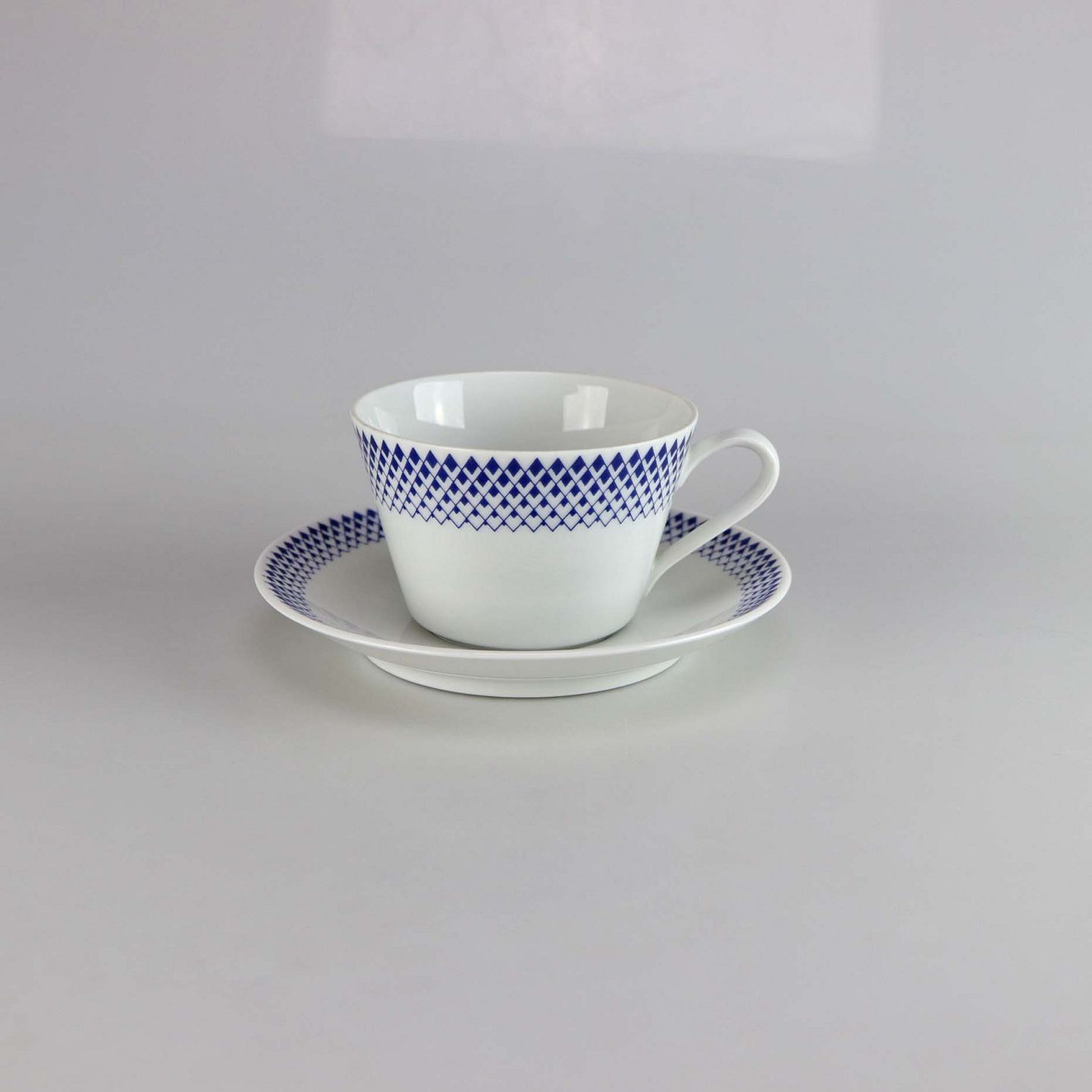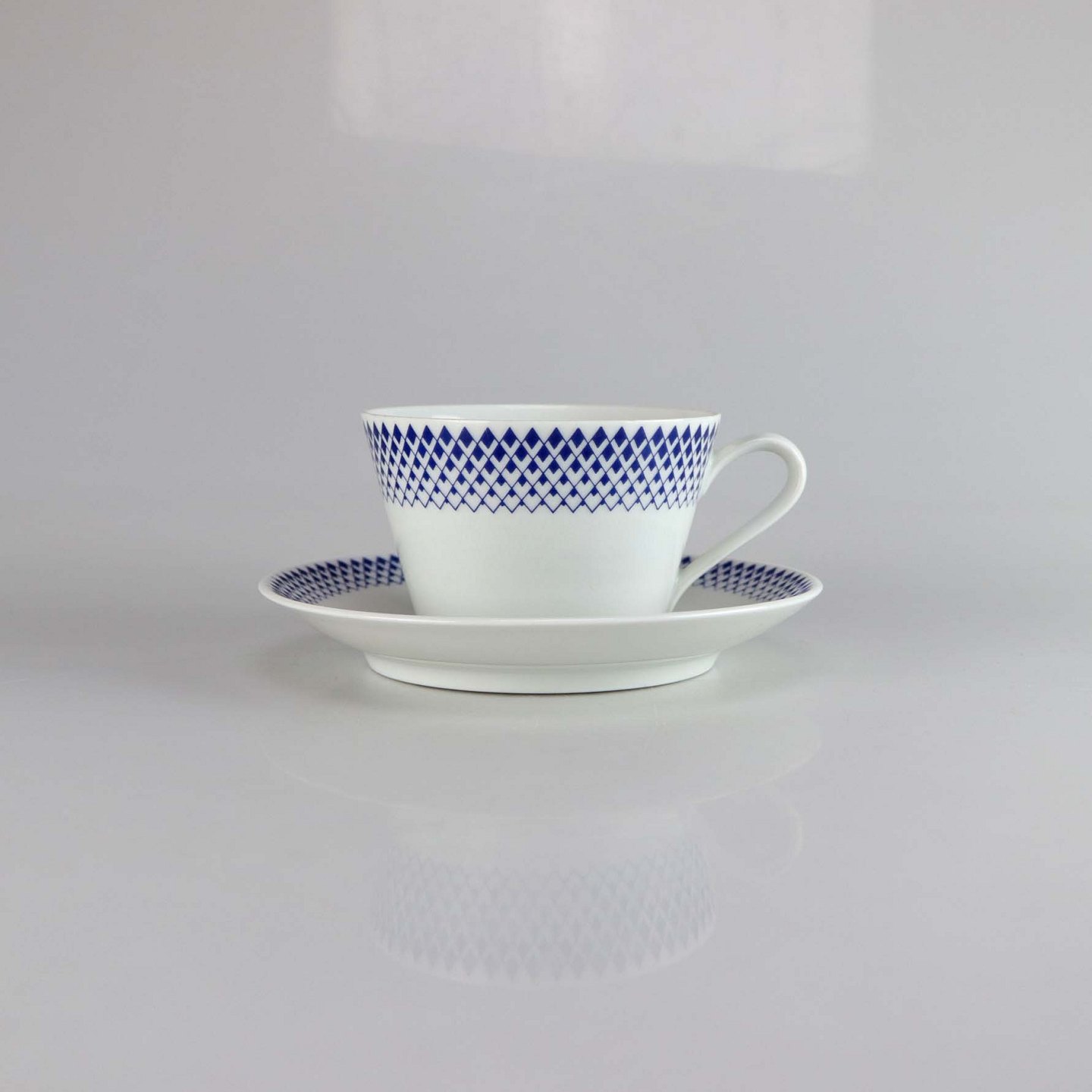 Glat hvidt porcelæn med dekoration af mørkeblå romber