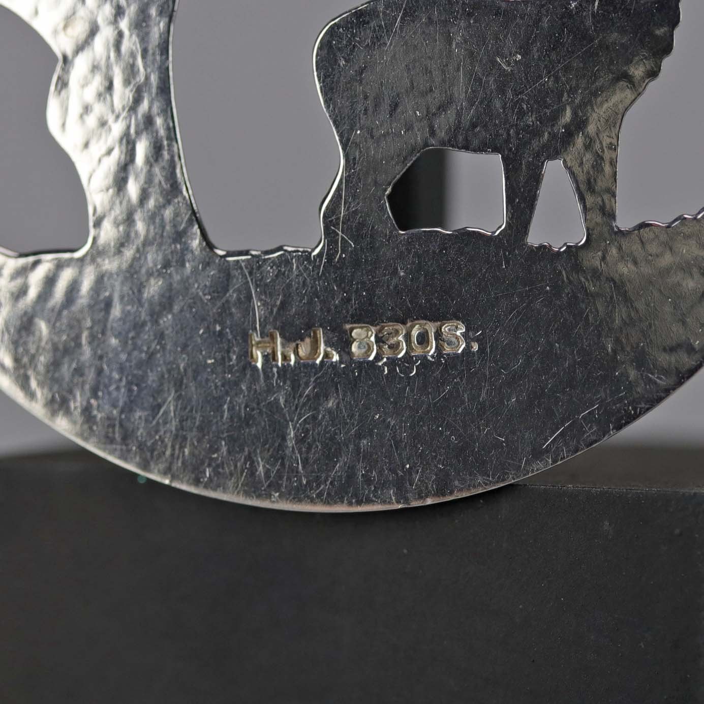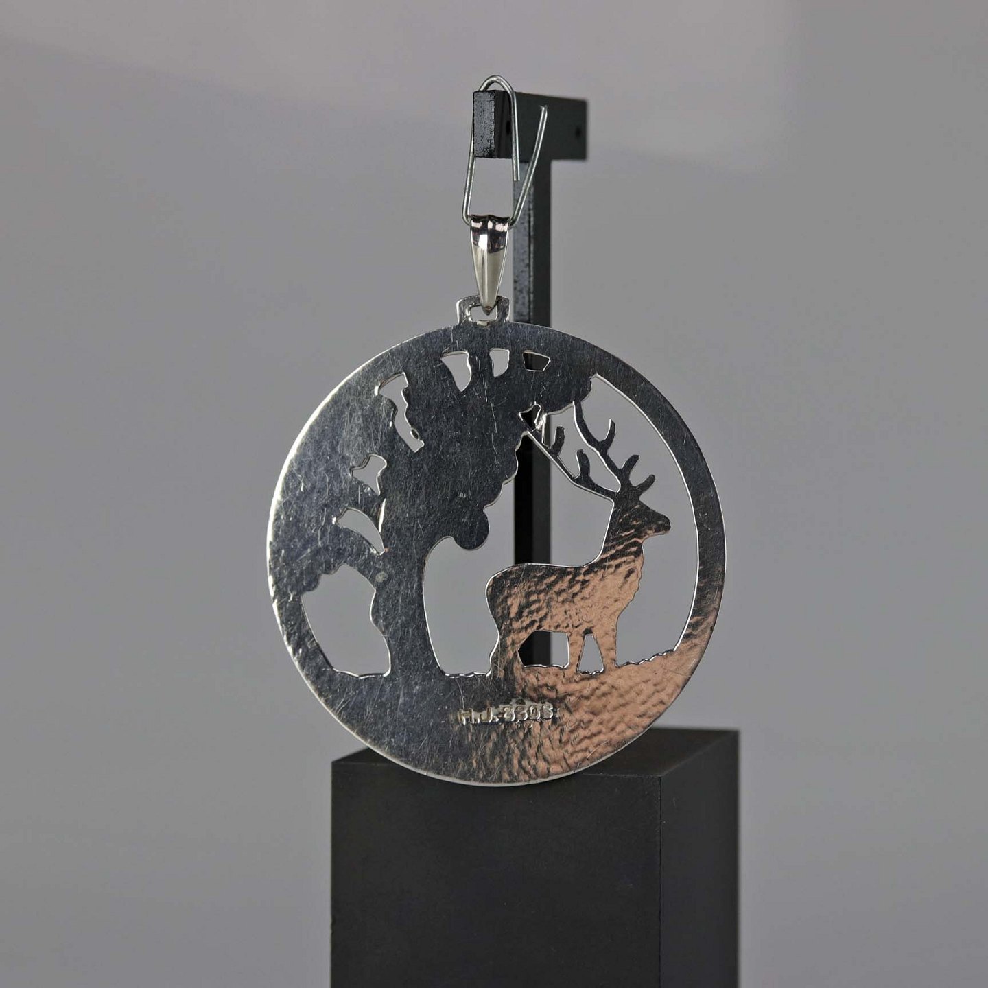 Rundt vedhæng i sølv med motiv af hjort og træ