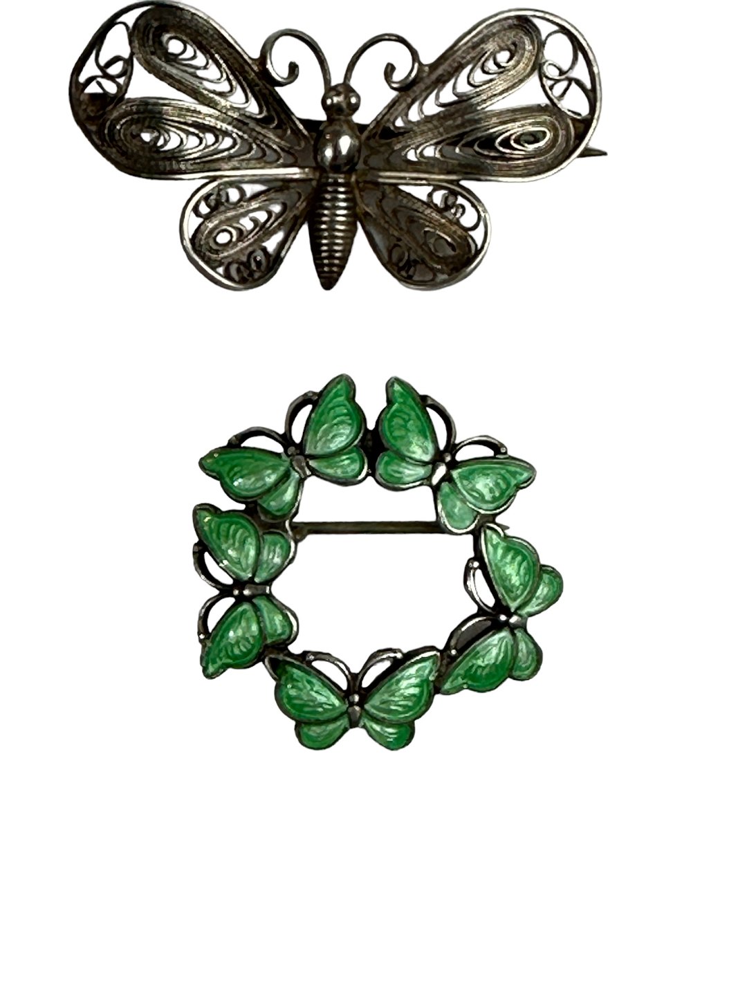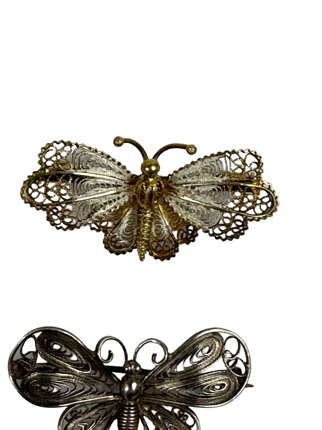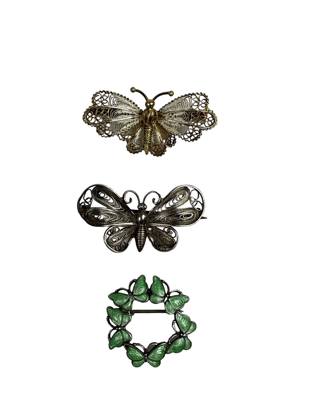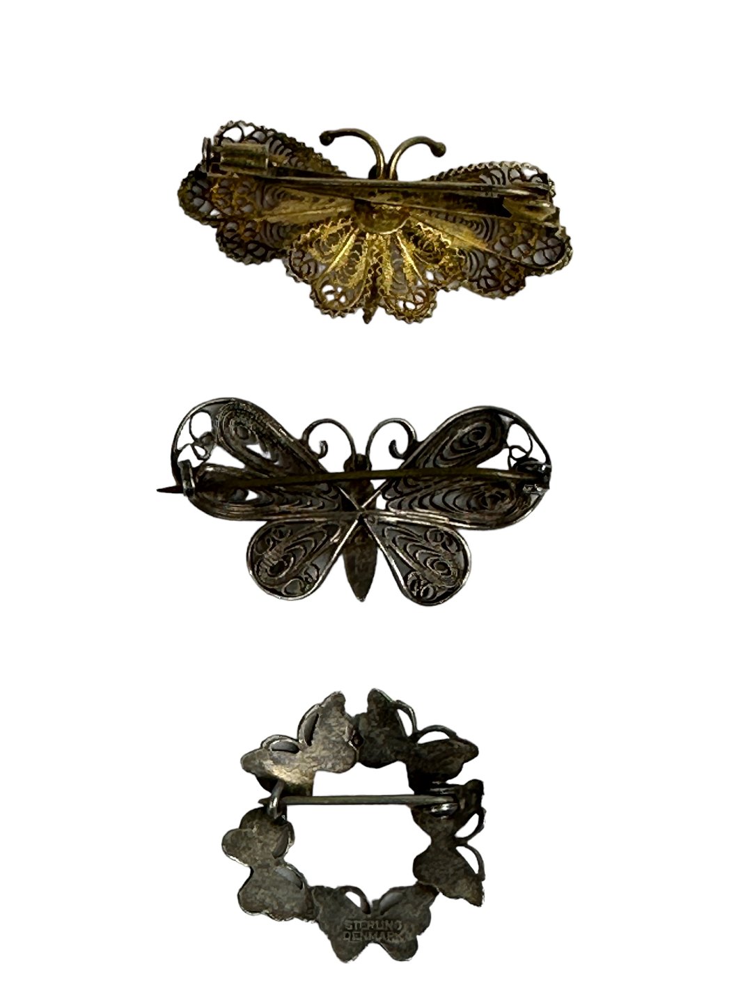Øverste sommerfugl forgyldt sølv, utydeligt stemplet med enten 800 eller 900 sølv. Cirka 4 x 2 centimeter. (Ikke på lager)
