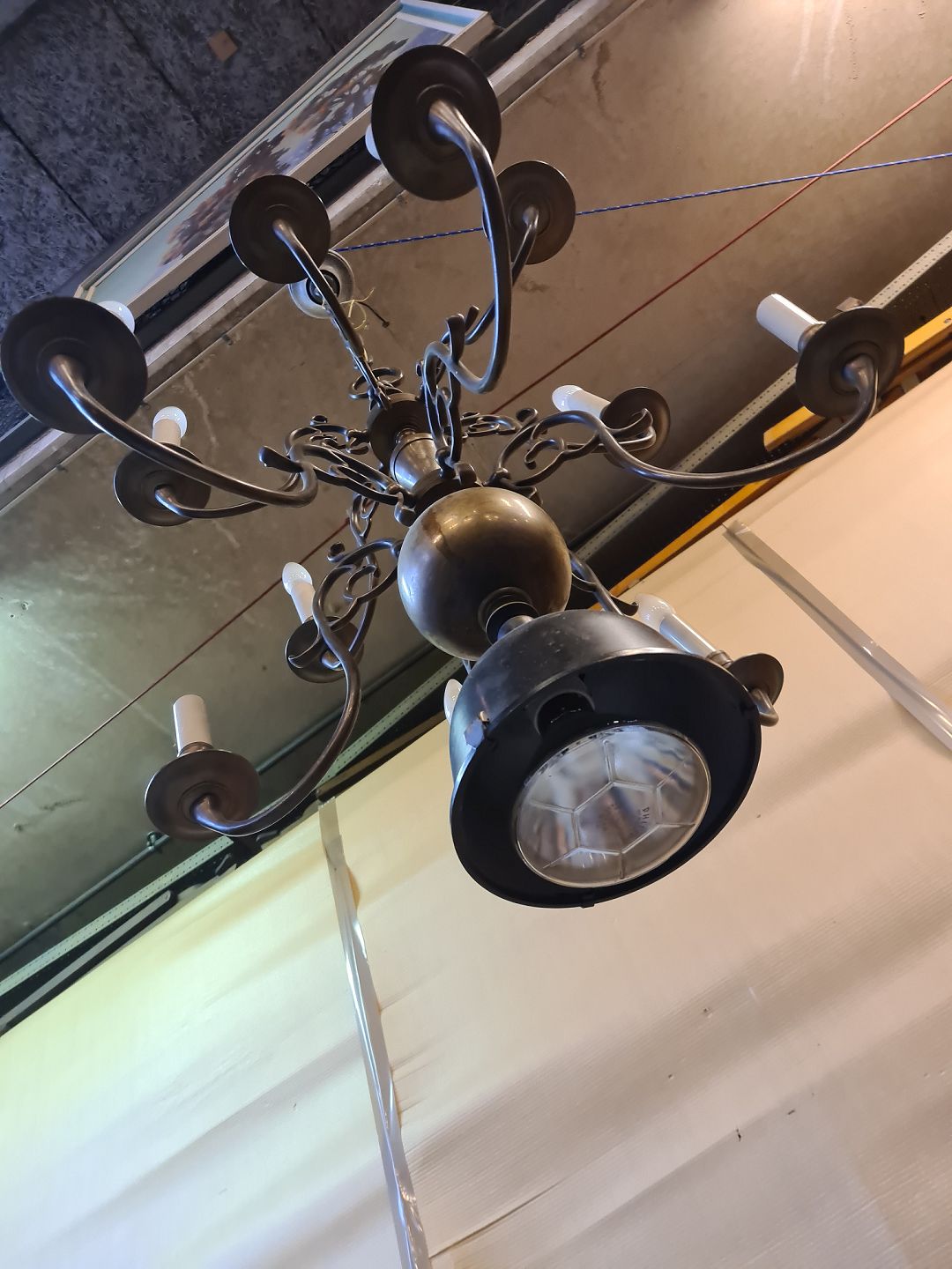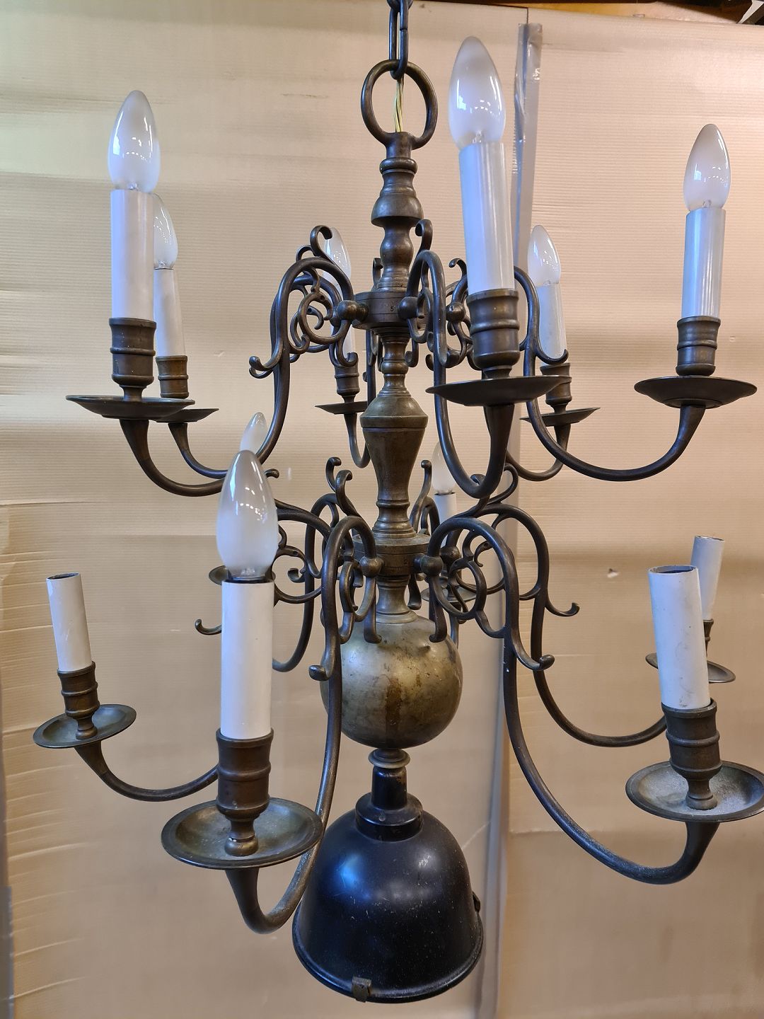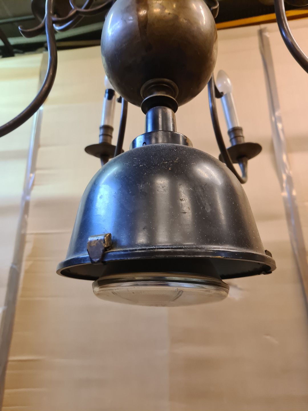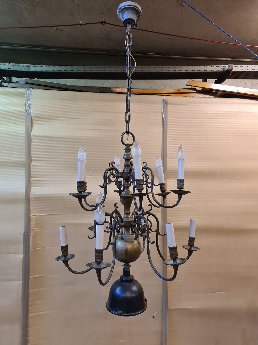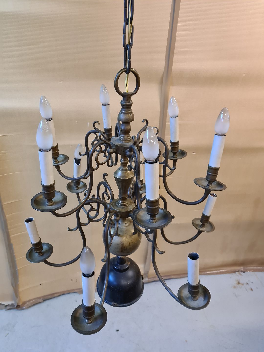 Kirkekrone i messing med 12 arme og eftermonteret spot til husalter, fra 1930erne.
