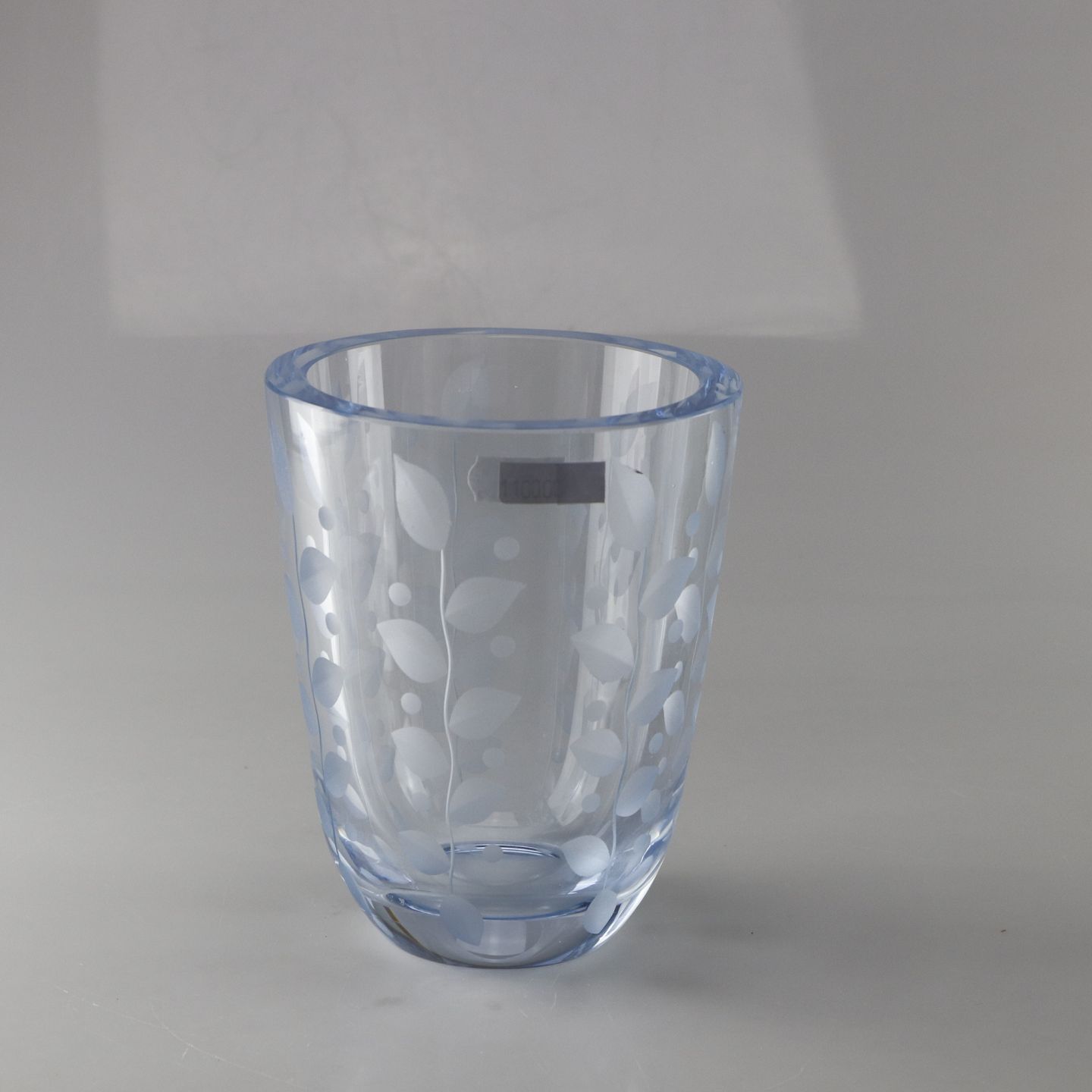 Vase i klart lyseblå glas med mønster af ranker med blade