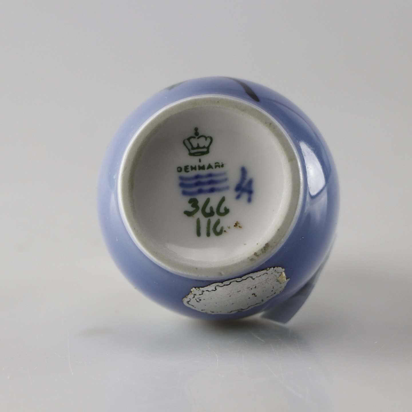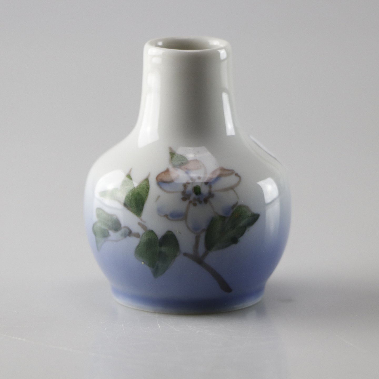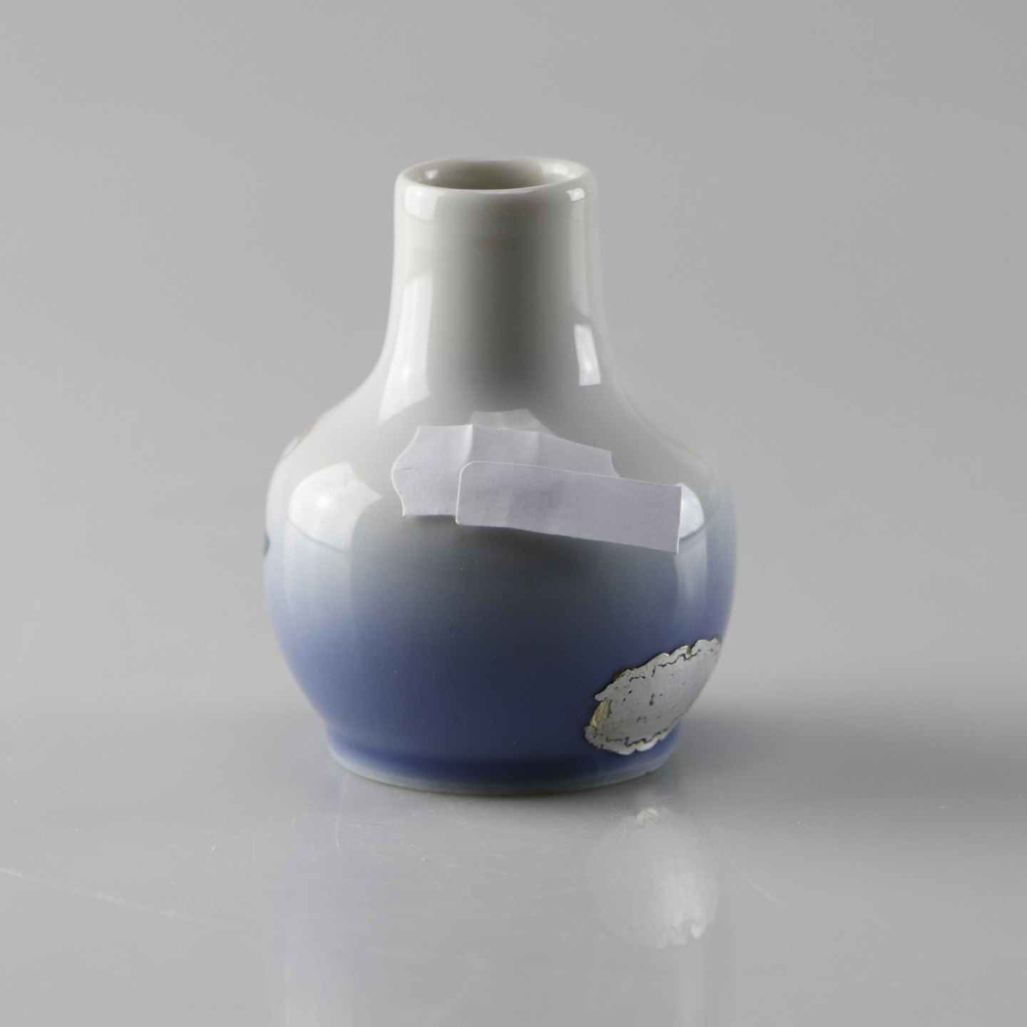 Mini vase i porcelæn med blåligefarver og motiv af en blomst og blade