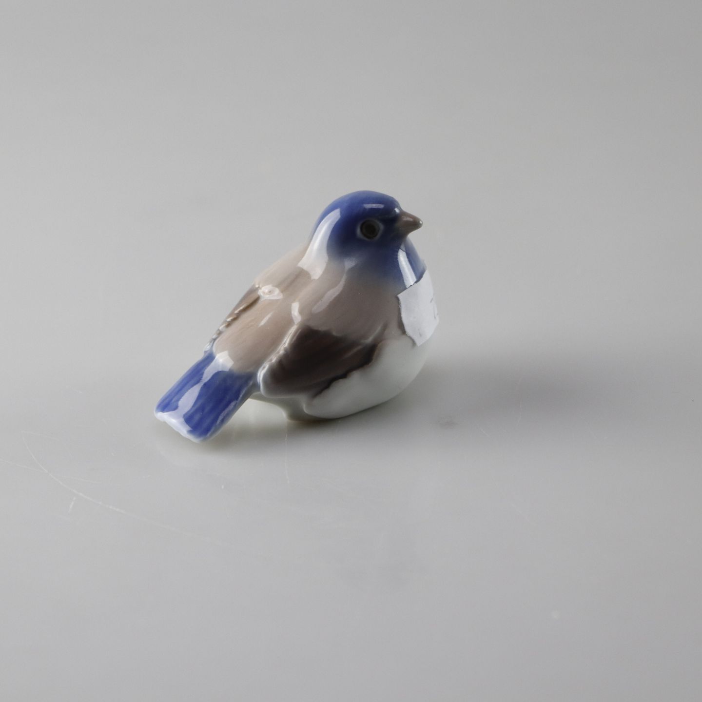 Figur i porcelæn med blå, brune og hvide farver