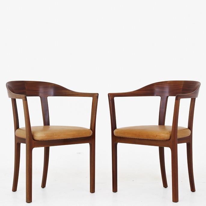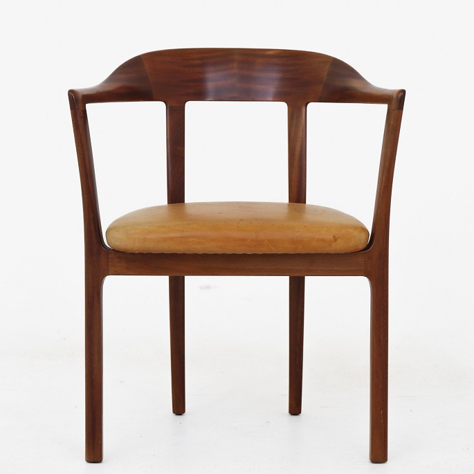 Karmstol i mahogni med sæde af patineret naturlæder.