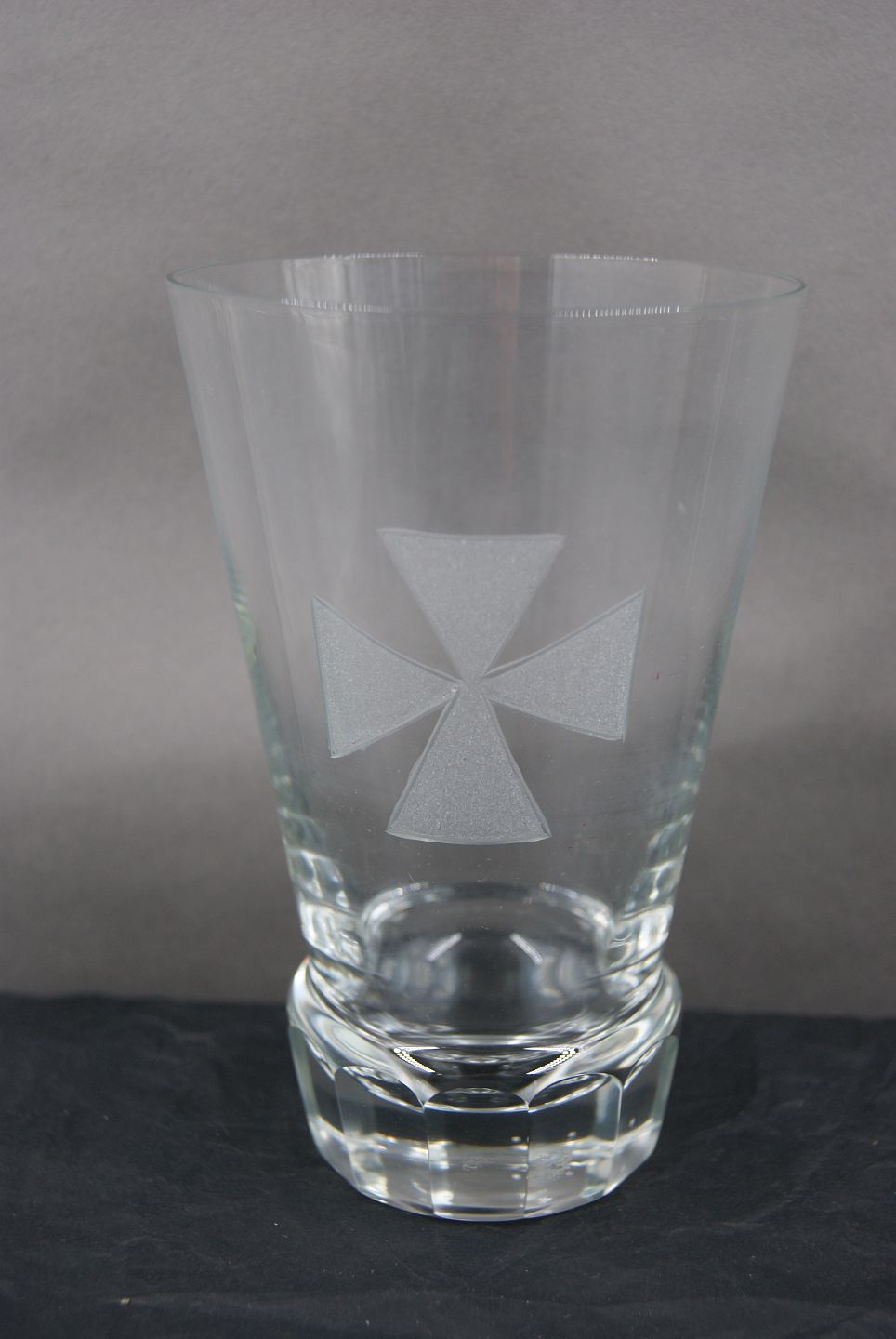 Frimurerglas, ølglas dekoreret med slebne symboler, på kantsleben fod