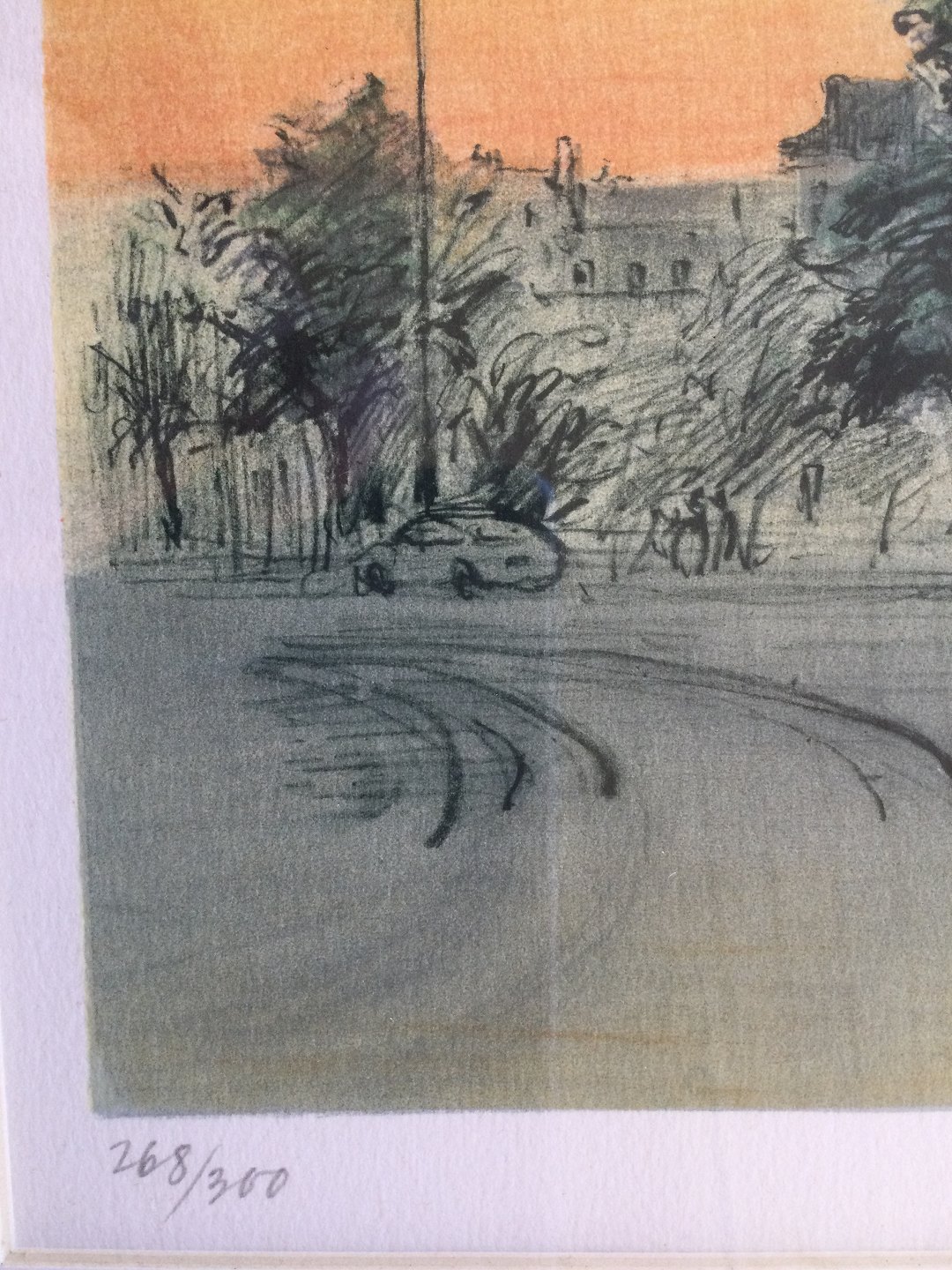 Litografi af Bo Bonfils 1981 - Parti fra Ved Stranden i København med Sankt Nikolaj Kirke.