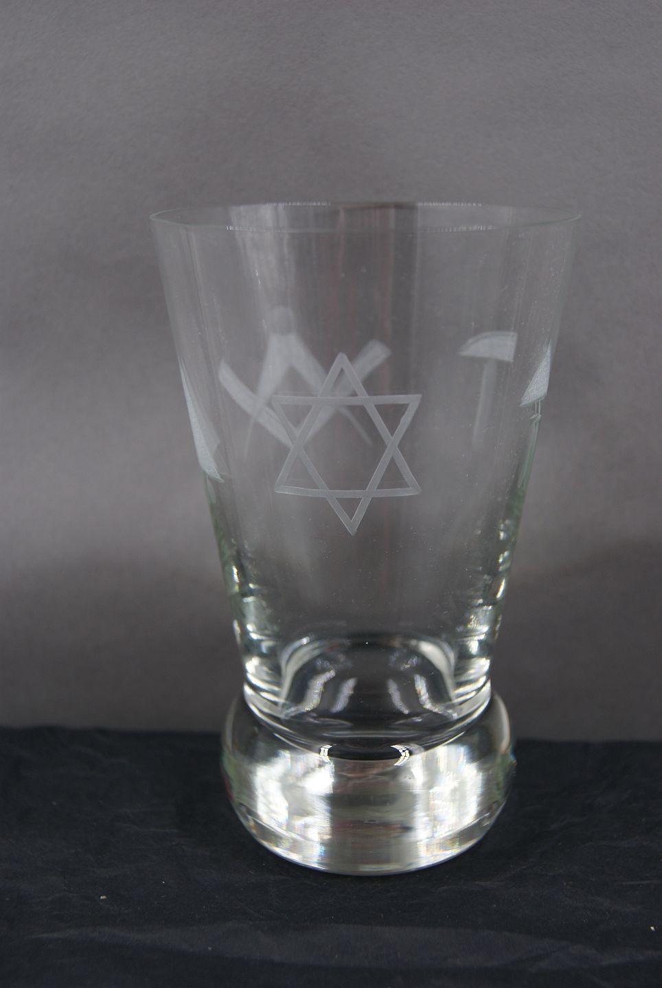 Logeglas eller Frimurer glas, ølglas dekoreret med slebne symboler på rund fod.