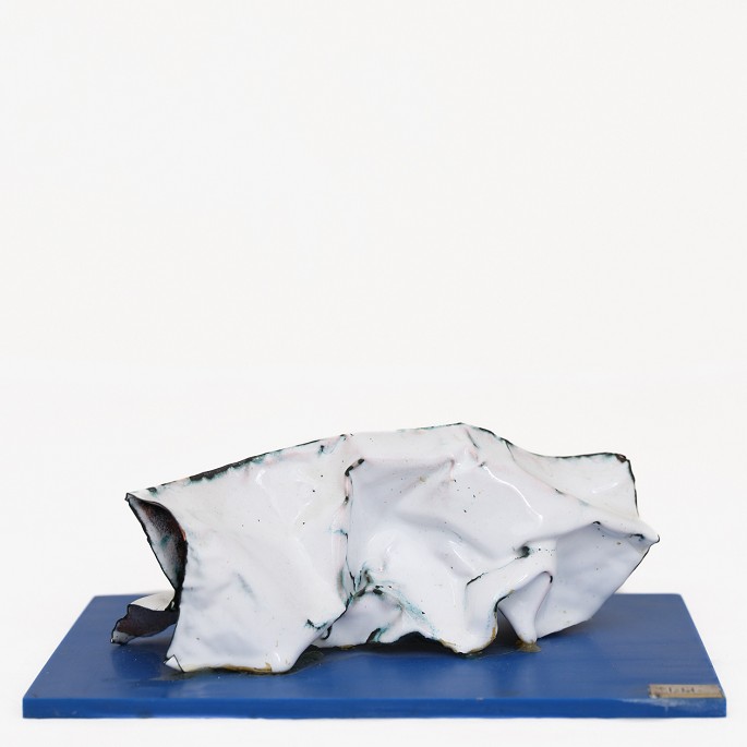 Unik hvid emaljeskulptur på bemalet blå fod. Signeret. H. 11,5 cm.