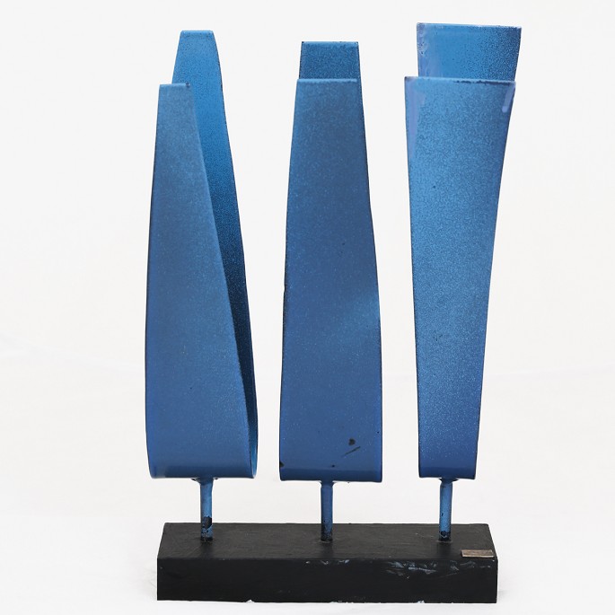 Unik blå emaljeskulptur med tre justérbare elementer. Signeret. H. 39 cm.
