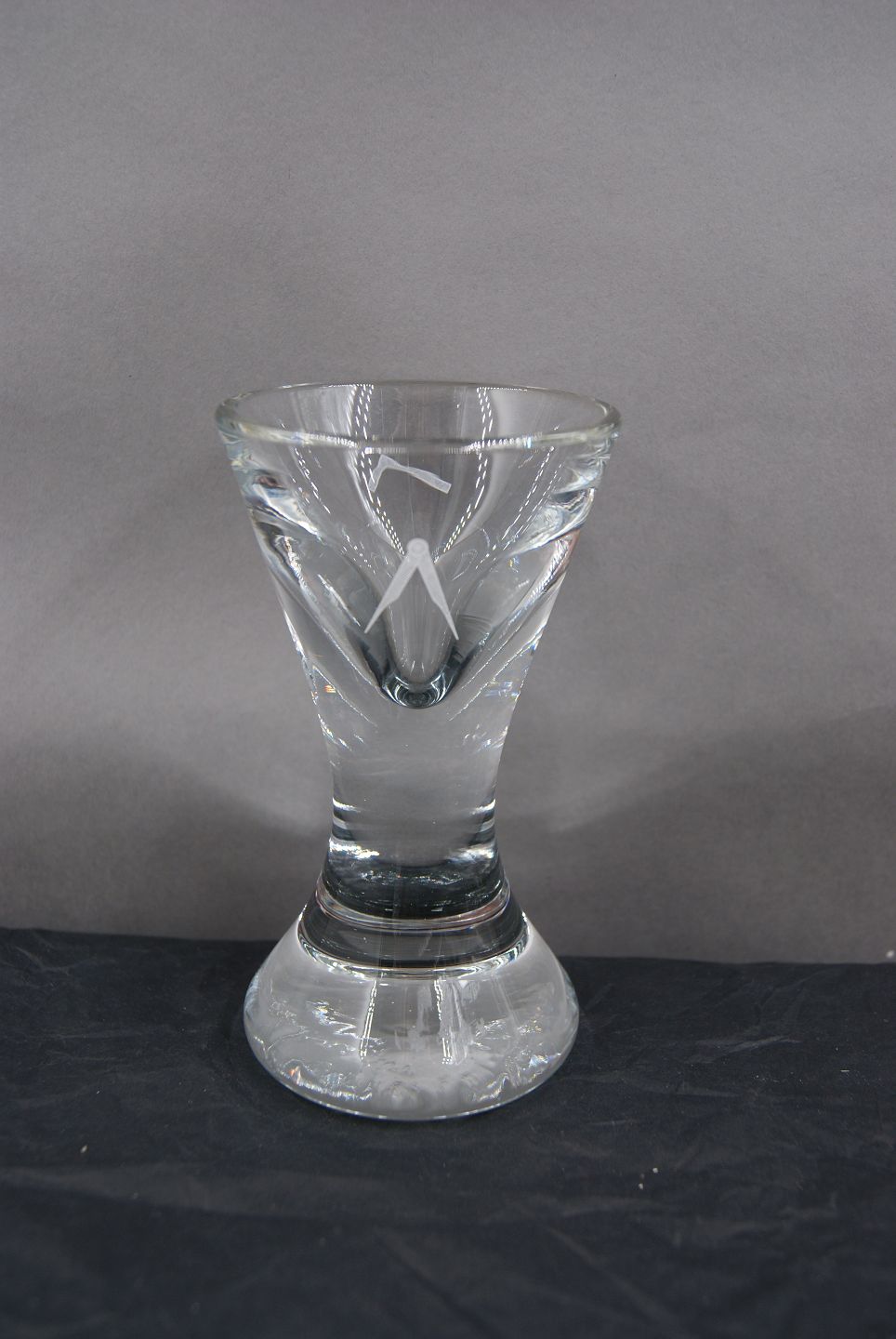 Frimurer glas eller Loge glas, drikkeglas dekoreret med slebne symboler, på tyk, rund fod.