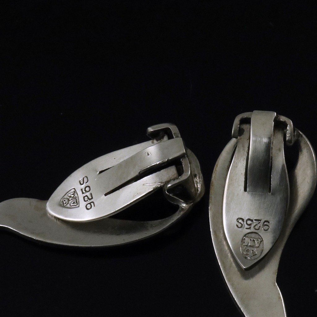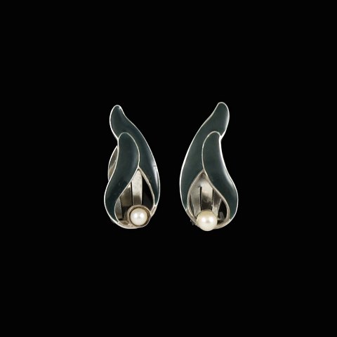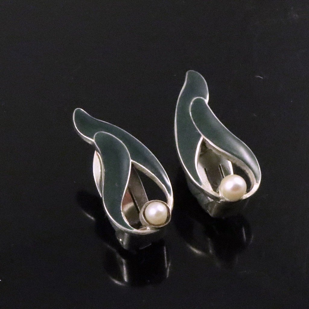 A. Michelsen. Sterling Silver Ear Clips with Green Enamel and Pearls.