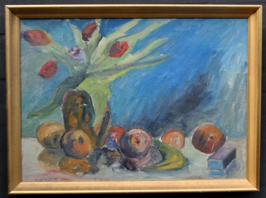 Høtoft, Anker (1877 - 1939) Denmark: Arrangement with apples and tulips on a table. Oil on canvas. Signed 1934. 47 x 65 cm.