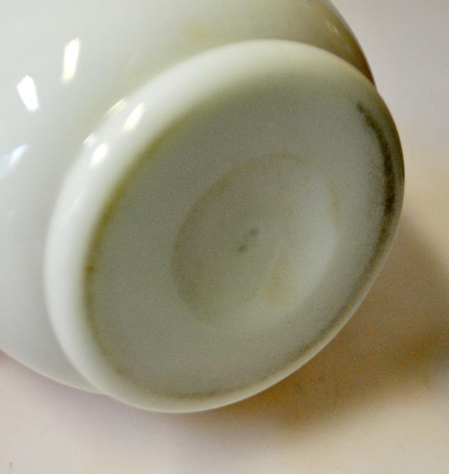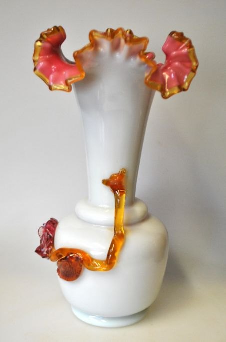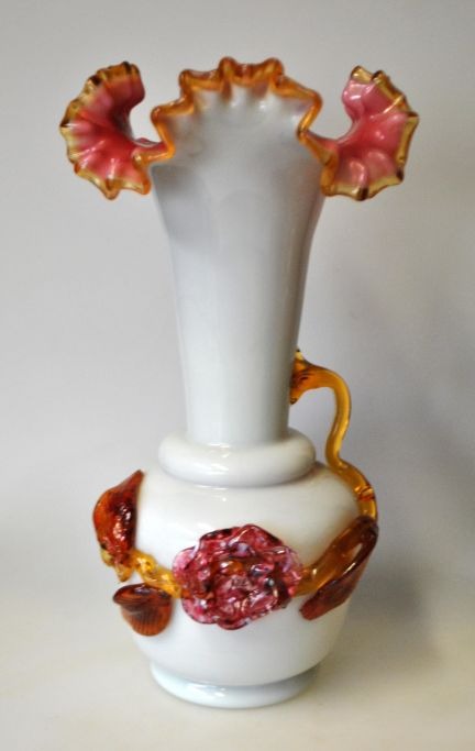 Jugend glass vase, approx. 1900. Lötz. Germany. White opal glass. Collared edge, and with attached floral decorations on the side in brown and reddish glass. H.: 27.5 cm.