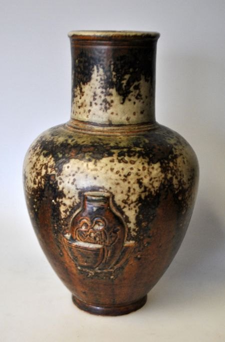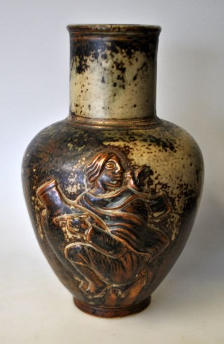 Royal Copenhagen vase with relief, no. 20247, Design: Jais Nielsen (1885 - 1961). Relief decoration with potter. Sung glaze. H.: 24 cm.