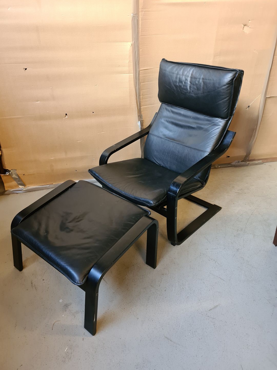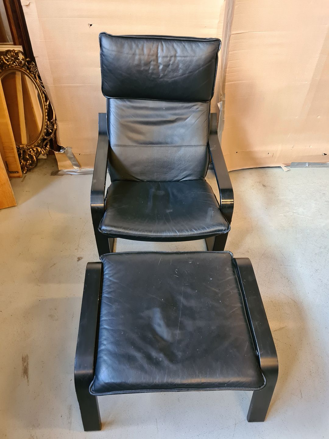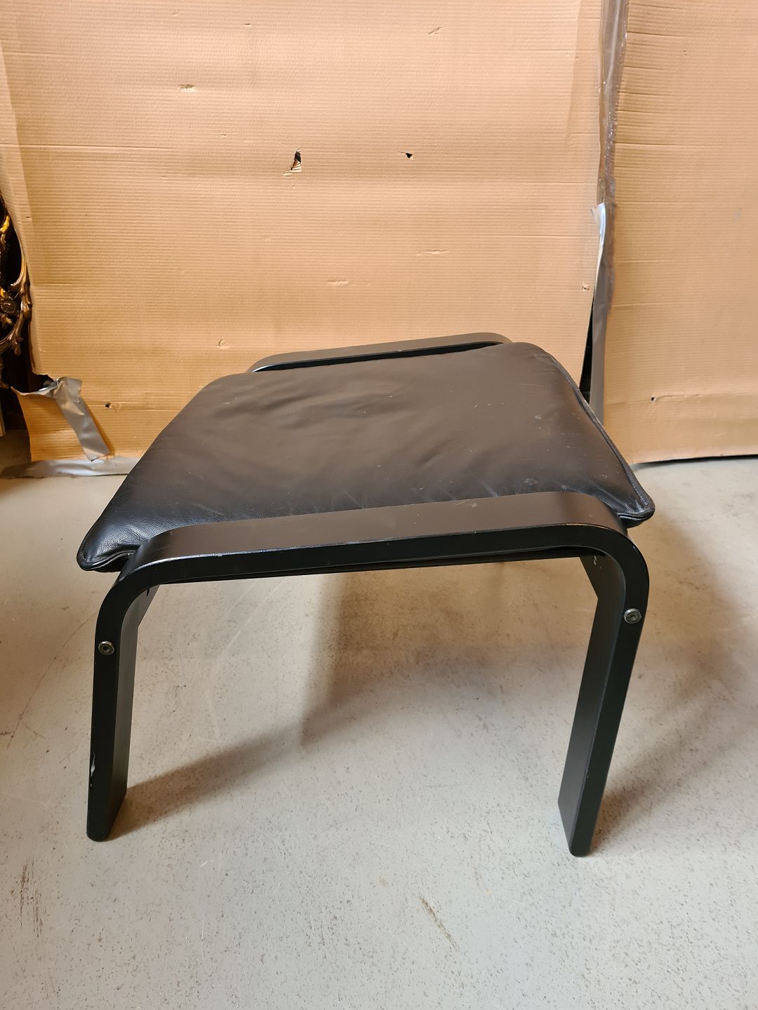 Lænestol og skammel i malet træ med læderhynder, fra 1990erne.