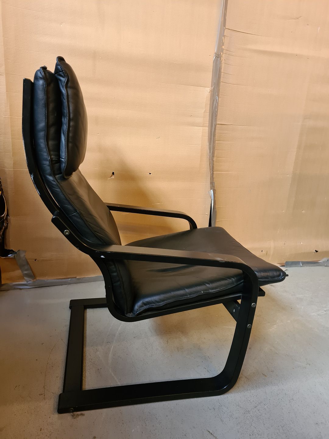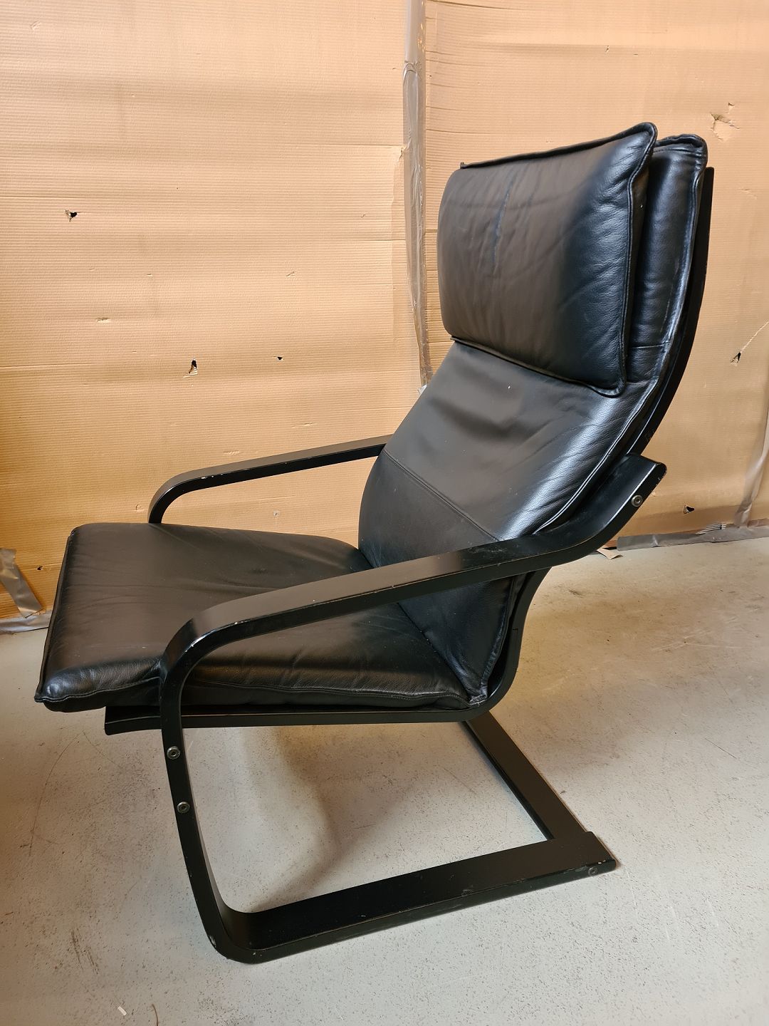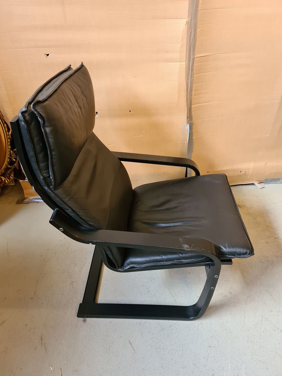 Lænestol og skammel i malet træ med læderhynder, fra 1990erne.